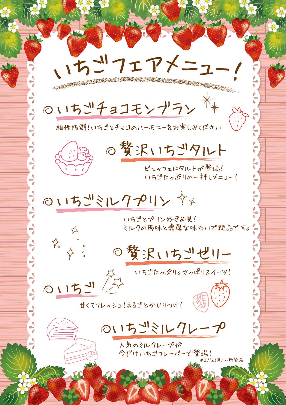 いちごフェアーは期間限定、なくなり次第終了ですので、お早めに旬のフルーツを味わいにお越しくださいませ。