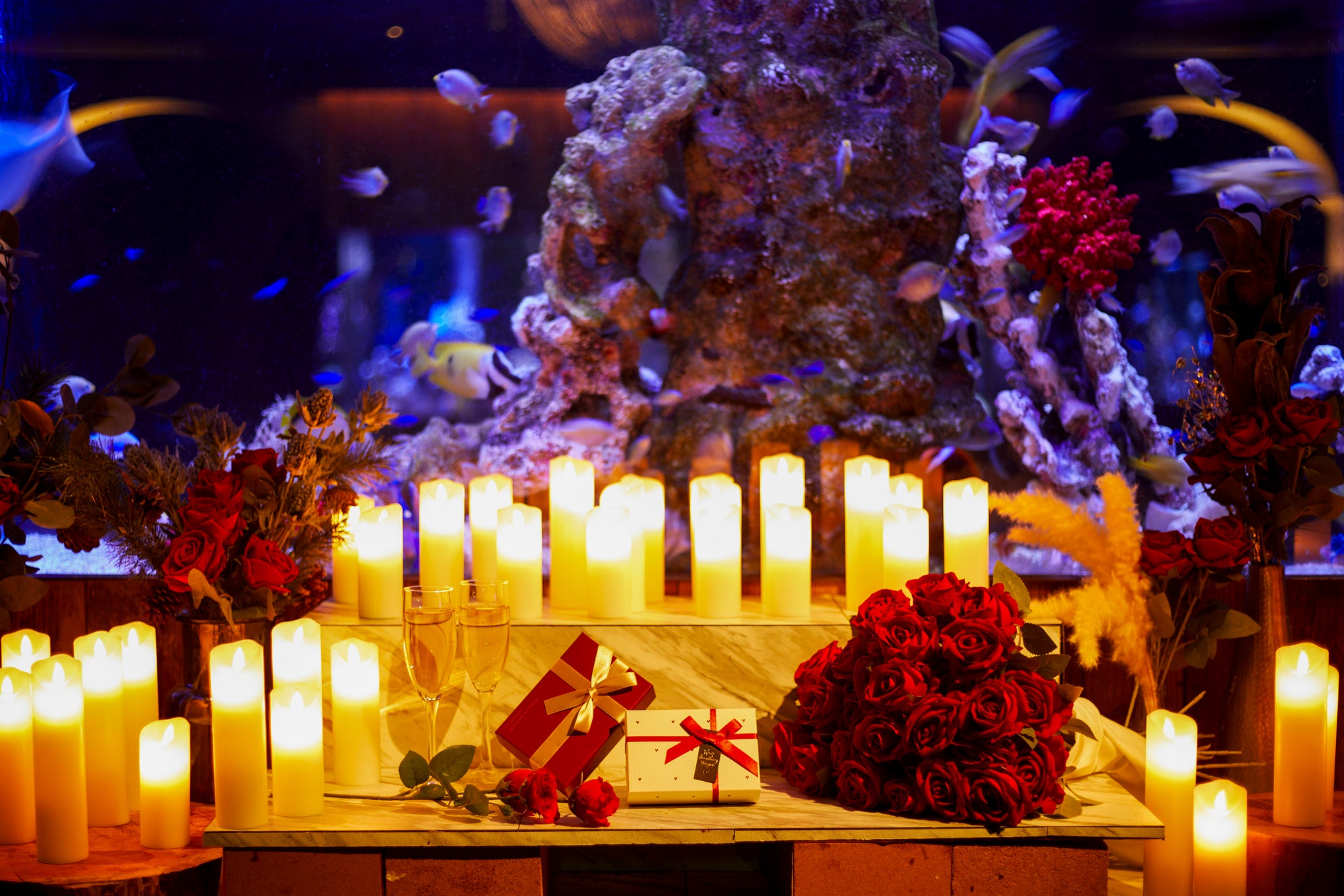 一万匹の熱帯魚がお出迎えする、まるで水族館のような店内に200本以上のキャンドルを設置。