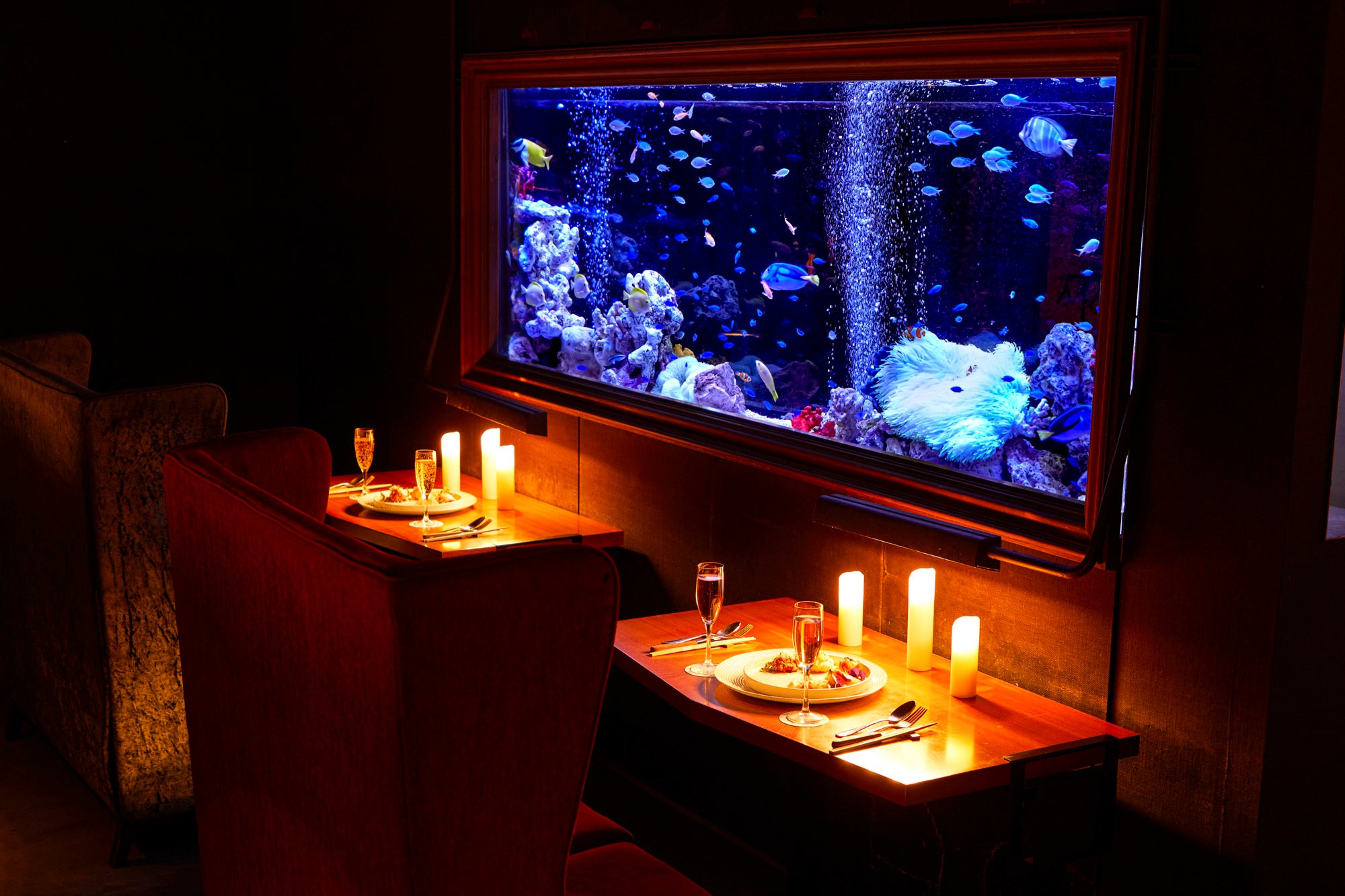 ※キャンドルで彩られた目の前が水槽の2名専用ペアソファー