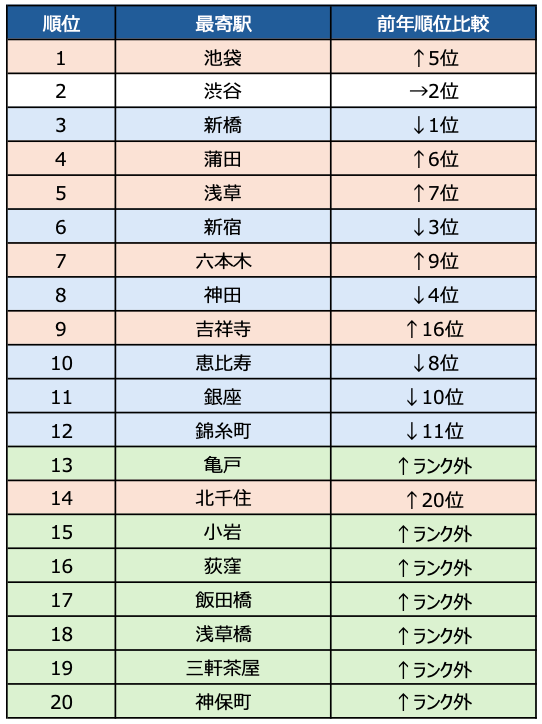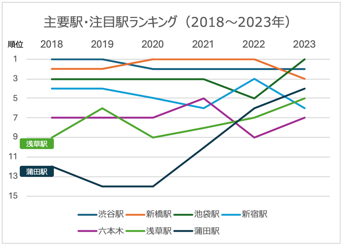 渋谷、新橋、池袋がトップをほぼ独占している一方で、徐々に順位を上げているのが浅草と蒲田です。