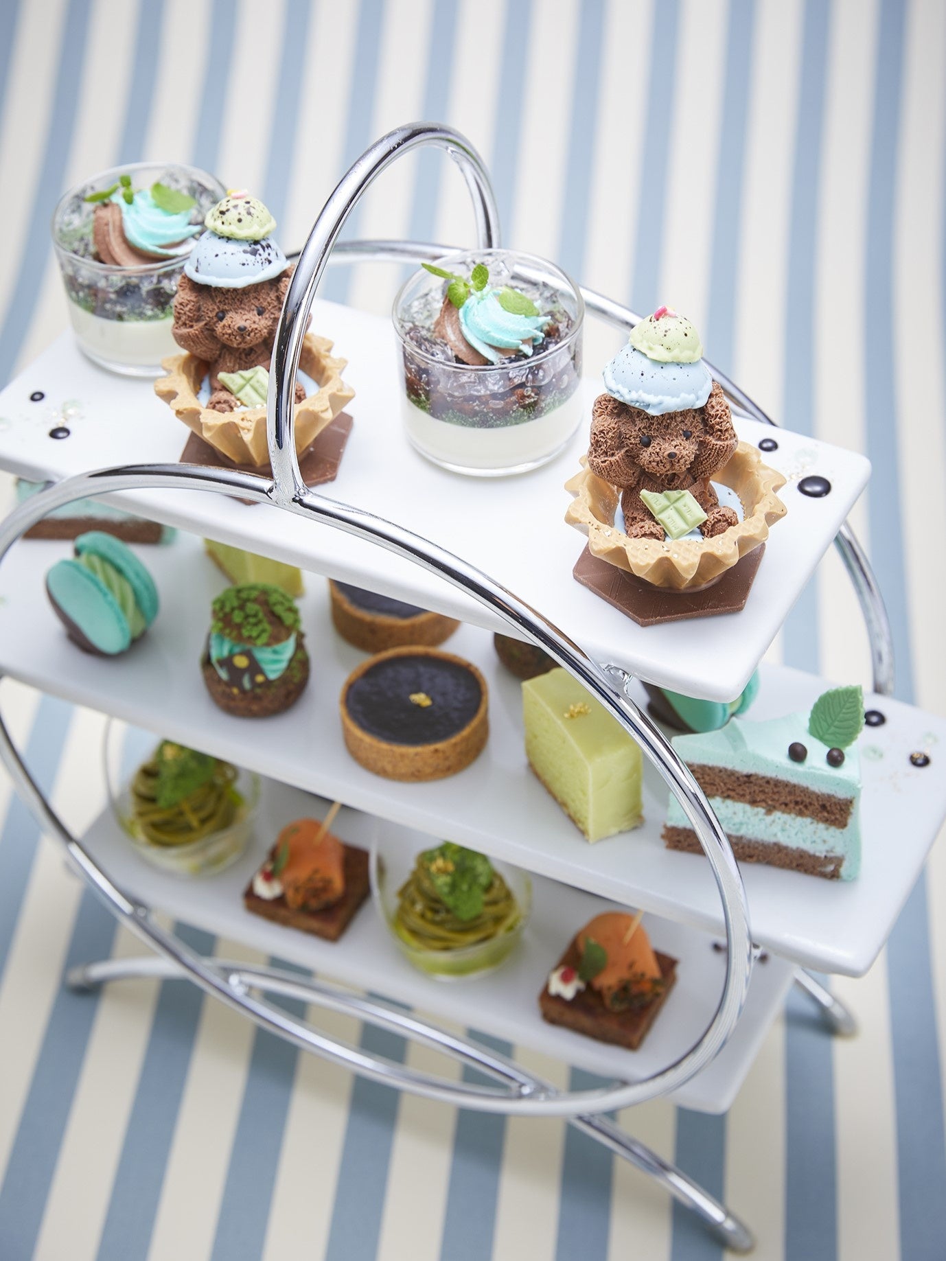 「チョコミントアフタヌーンティー」は、チョコミント好きの方によりお楽しみいただけるよう、前回に増して清涼感たっぷりのスイーツが登場。チョコミントアイスを頭に乗せたキュートなくまのチョコレート細工は、ミントガナッシュを仕込み、爽やかな味わいを堪能できる一品です。