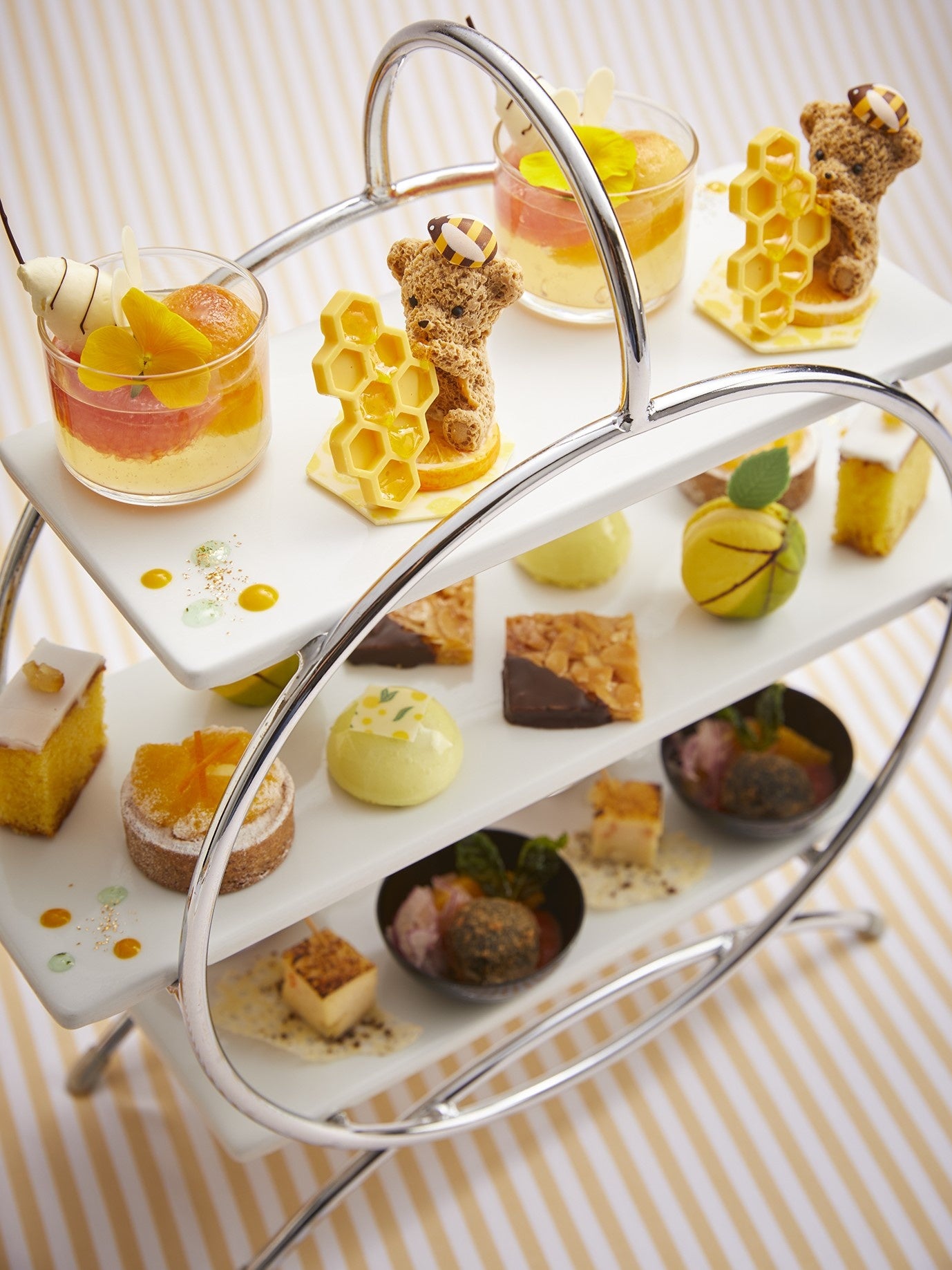 「シトラスとはちみつのアフタヌーンティー」は、はちみつを堪能する愛らしいくまのチョコレート細工がお出迎え。甘酸っぱいレモンのチョコレートで仕上げた蜂の巣から垂れる、艶やかなはちみつをイメージしたナパージュもショコラティエのこだわりです。また、穏やかな酸味の八丈フルーツレモンを皮ごと使用してしっとり焼き上げたレモンケーキや、果汁たっぷりジューシーな清見オレンジの味わいをお楽しみいただけるよう、はちみつでマリネした清見オレンジをトッピングしたタルトなど、さまざまな柑橘フルーツでアレンジしたスイーツがラインナップ。