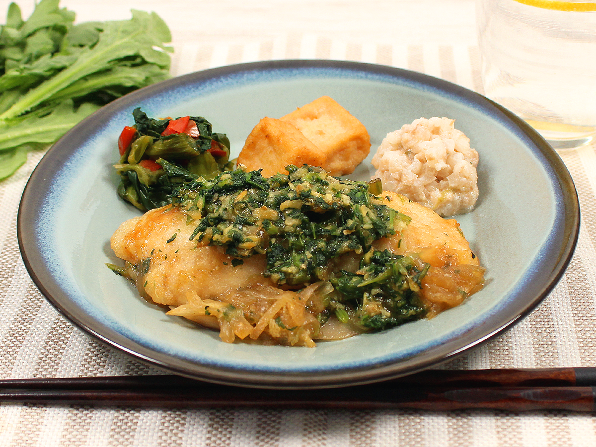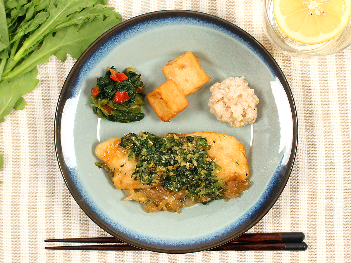 副菜は、ごましょうゆ味の小松菜の和風サラダ、おろしだれで和えた絹揚げ豆腐、大根とツナのタルタルあえです。