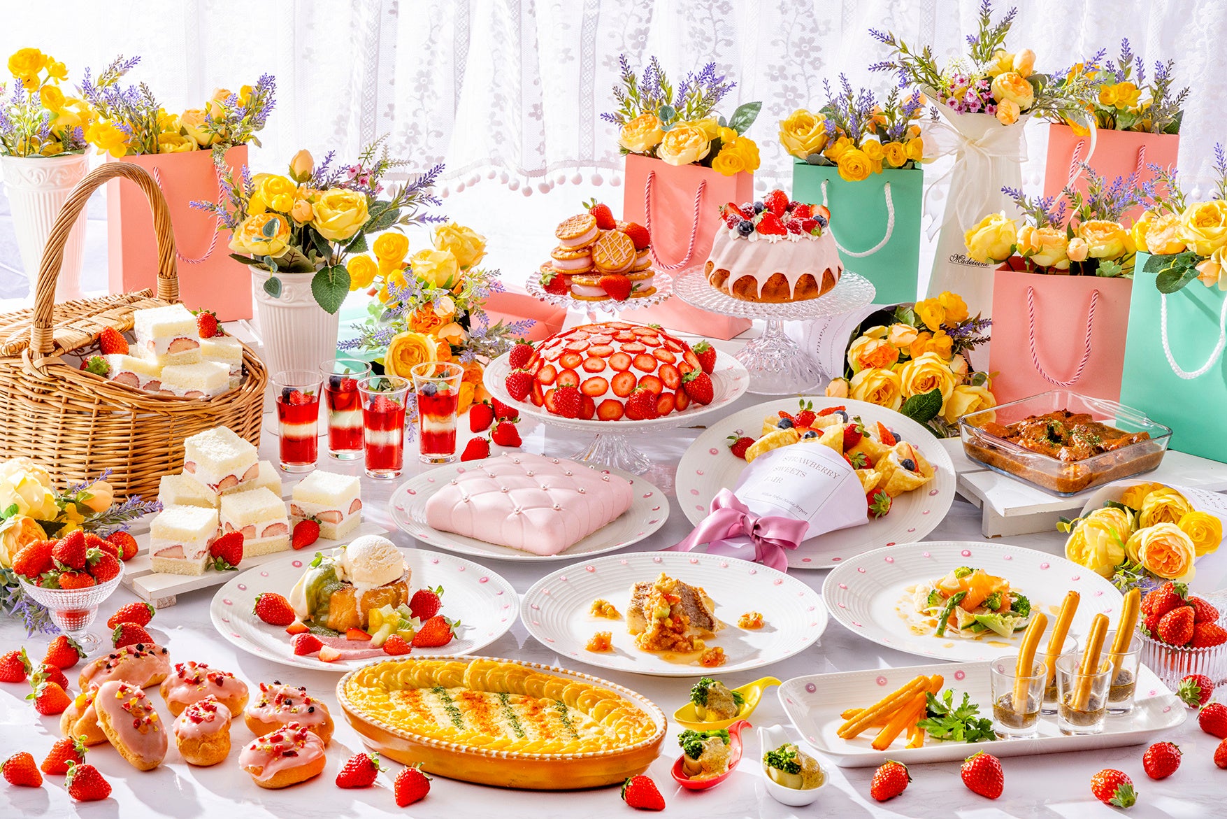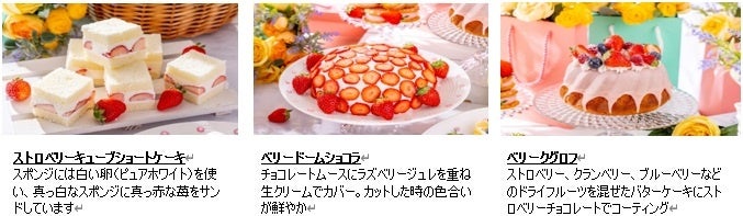 ストロベリーギモーヴサンド/ストロベリーエクレア/ストロベリーマトラッセケーキ/ベリークグロフ/いちごとさくら餡のクレープ/ベリードームショコラ/ストロベリーキューブショートケーキ/ストロベリーシフォンケーキ/ストロベリーパンナコッタ/ストロベリーゼリー/ストロベリーシナモンクランブルなど