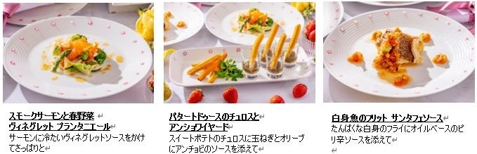 イチゴと小柱、野菜のサラダ 青のりのジュレ/新玉ねぎのブリュレ/スモークサーモンと春野菜 ヴィネグレット プランタニエール/春キャベツのフランと桜香るフェッテ・サレ/ホタテ貝 春の香りの蕗の薹、オリーブ、粒マスタード/サラダバー(ドレッシング/コンディメント各種)/フレッシュフルーツ盛合せ/ホールチーズのスペシャルシーザー(平日ディナー)