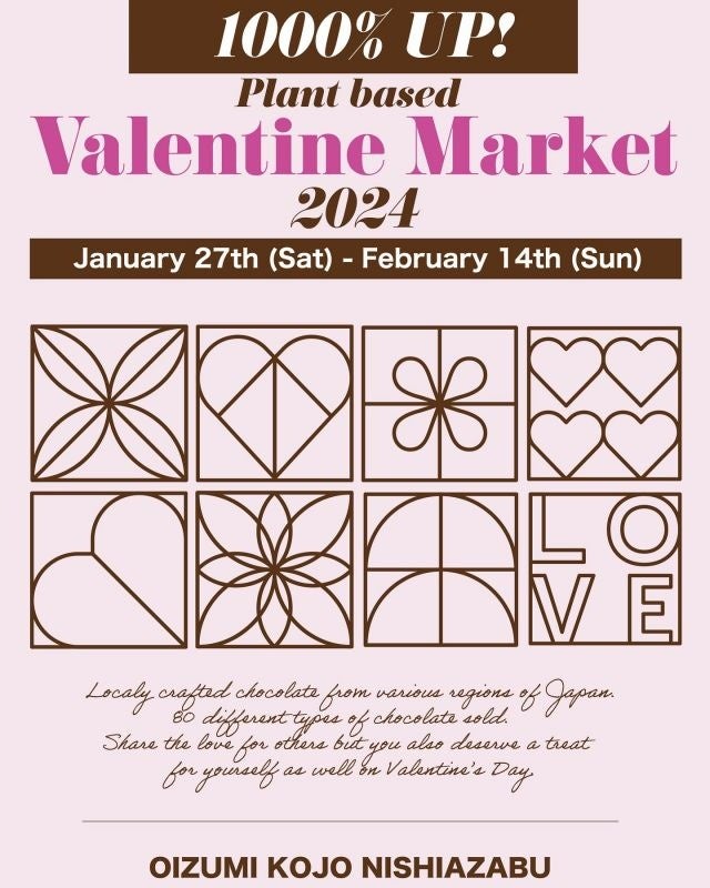 株式会社大泉工場(本社:埼玉県川口市、代表取締役:大泉寛太郎)が運営する、無農薬の国産野菜やプラントベースのグローサリー商品や、当社オリジナルコンブチャブランドの発酵スパークリングティー「_SHIP」などを販売するUrban Grocery「大泉工場NISHIAZABU」(https://oks-nishiazabu.com/)は、1月27日(土)から2月14日(日)の間、植物由来の食材のみを使用したプラントベース(植物性)チョコレートを集めたフェア「1000%UP! Plant Based Valentine Market 2024」 を開催します。