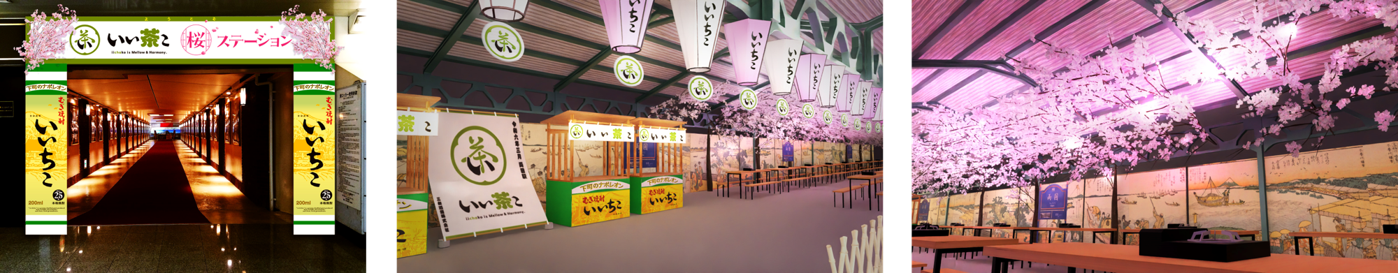 『幻の3番線ホーム』へと繋がる両国駅ステーションギャラリーの入り口では桜に彩られた「いい茶こ 桜ステーション」のタイトルボードがお出迎え。その先にあるホームでは、茶屋をイメージした特設の販売ブースや天井に施された満開の桜という非日常感と特別感ある空間で、風情を感じながらいいちこを緑茶で割った緑茶ハイ「いい茶こ」を楽しんでいただくことができます。