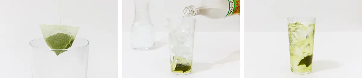 ①グラスに水出し緑茶ティーバッグを1つ入れ、氷を満たす