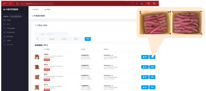 輸入者側でも同じように、専用機材で読み込み「正常またはクレーム(腐敗、箱潰れ)などを選択し写真を撮影しクラウドにアップロードします。クレームとして報告されると即時クラウド画面ではエラーレポートが作成され関係者に共有されます。輸入者側はいずれにせよ輸入した物を全品箱を開いて検品はするので、結果として同時に撮影しトラブル時のクレーム処理を迅速にできました。