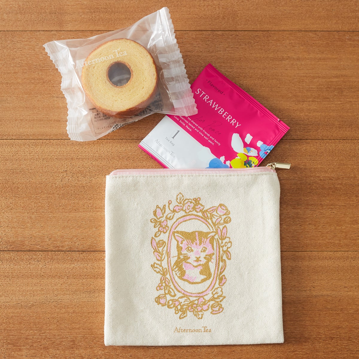 かわいいポーチにミルクバウムクーヘンとストロベリーティーが入った、春限定のティータイムセットです。