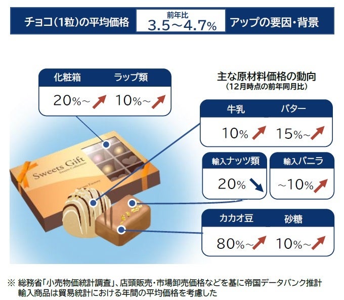 値上げの背景としては、主に原材料の調達コスト高騰が響いた。円安の影響に加え、主要生産国での輸出制限や天候不順による不作も重なり、カカオ豆の価格(推定)は昨年比で1.8倍に上昇した。砂糖や乳製品、チョコを包むアルミ箔やセロハン、箱などの包装資材、輸送費も大幅に値上がりしたことで、昨年に続き価格の引き上げに踏み切らざるを得なかったとみられる。