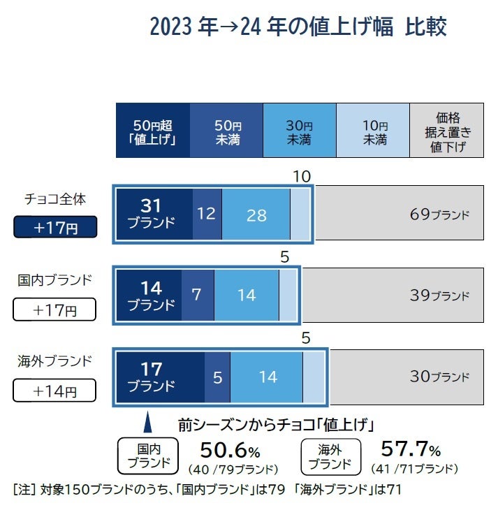 前年から価格が上昇したチョコを値上げ幅別にみると、最も多いのは「50円超」で、全体の約2割にあたる31ブランドとなった。昨シーズンから値上げを行ったブランドは計81に上り、前年(94)より1割超減少した。国内・海外ブランドともに半数超が昨シーズンから値上げした。