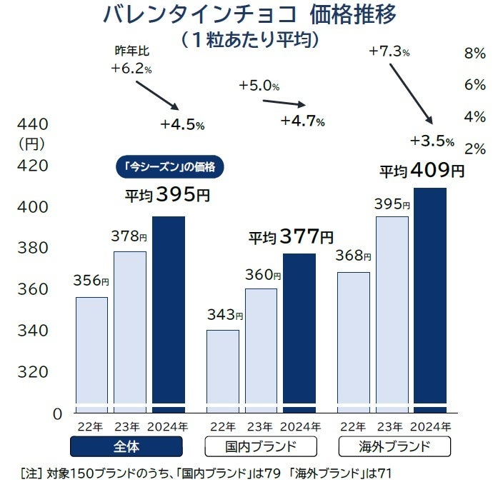 このうち、国内ブランドは前年から17円・4.7%アップの377円、ハイブランド品が多いフランス産やベルギー産など海外(インポート)ブランドは14円・3.5%アップの409円だった。大幅な価格引き上げが目立った昨年に比べ、2024年の値上げ幅は小さいほか、特に海外ブランドでは1粒当たりの値上げが国内ブランドに比べて小幅だった。そのため、国内と海外ブランドチョコの平均価格も、24年は32円差と昨年(35円)に比べて3円縮小し、海外ブランドのチョコで相対的な割安感が強まる結果となった。