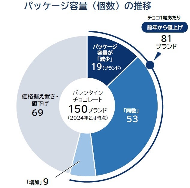チョコの値上げが続くなかで「実質値上げ」の傾向も強まった。チョコ1粒あたりの価格を前年から値上げした81ブランドのうち、パッケージ容量が前年から「減少」したブランドは19に上った。こうした動きは国内外のブランドを問わずみられ、パッケージの総額では価格据え置きや値下げとしたものの、昨年から容量(個数)を減らし、1粒当たりの単価を引き上げたケースが多かった。