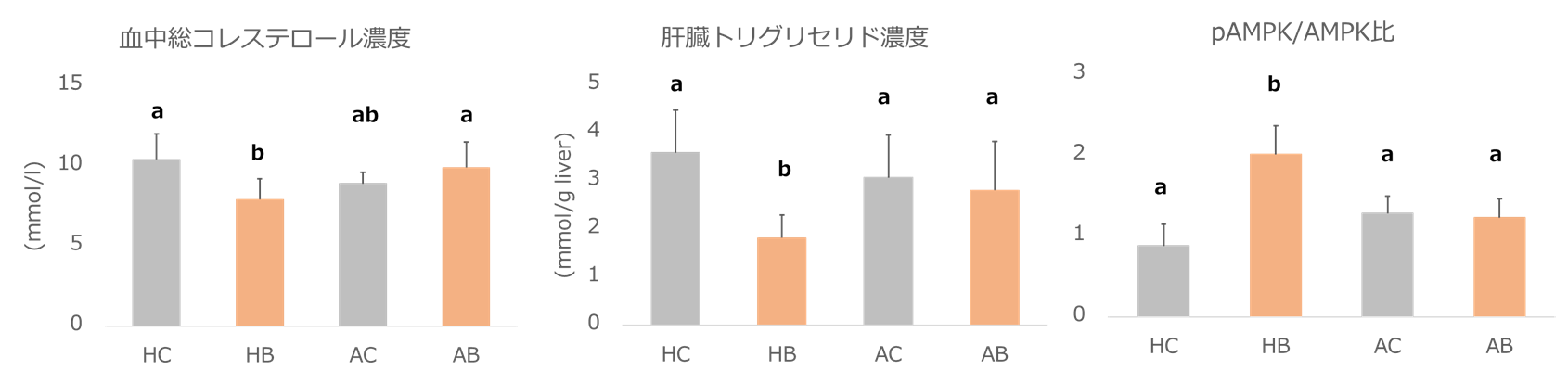 試験1よりHC群と比較してHB群でAMPが増加したため、肝臓内のAMPK濃度を測定しました。HC群と比較してHB群ではpAMPK濃度及びpAMPK/AMPK比が有意に増加し、AMPKが活性化することが示唆されました。この効果はACとAB群の比較では見られませんでした。