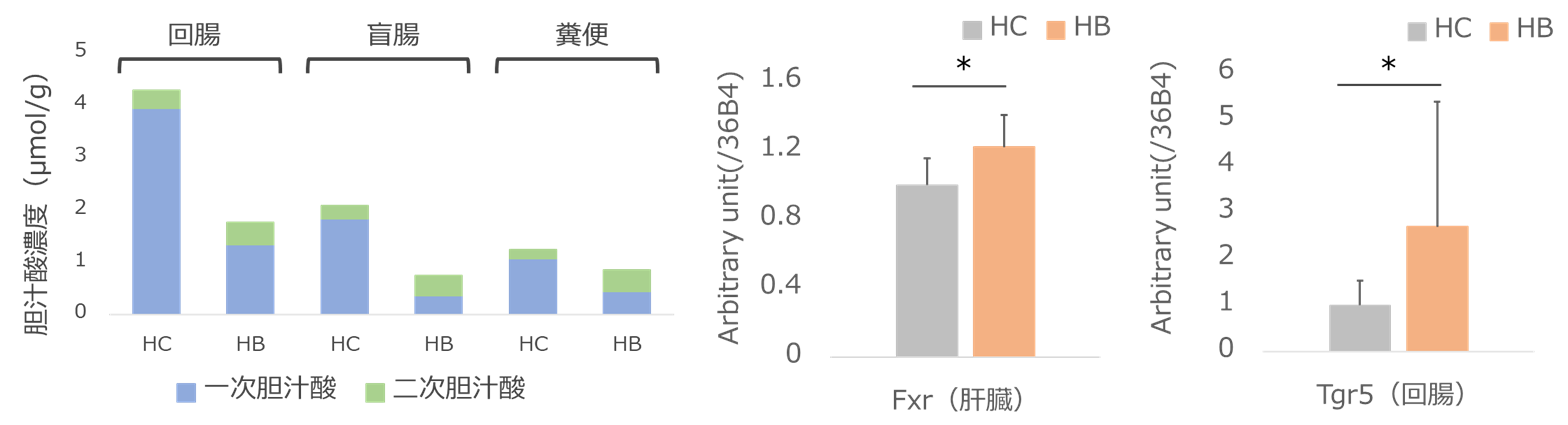 HC群と比較して、HB群で血中脂質量が有意に低下し、肝臓脂質量も低下傾向を示した一方で、糞便中の脂質量に差はありませんでした。HB群では盲腸内で一次胆汁酸10)量が有意に低くなり、一部の二次胆汁酸11)量が有意に増加しました。