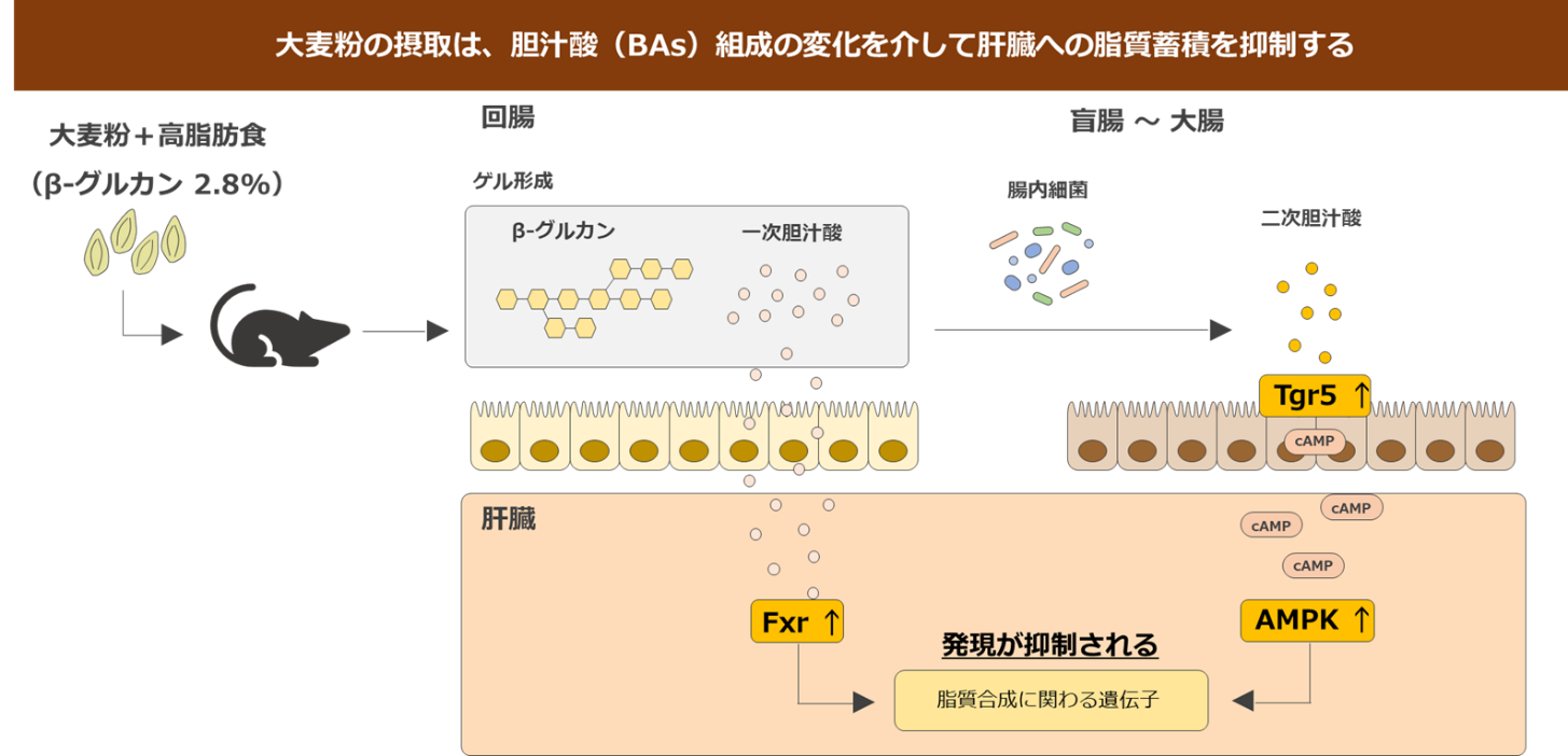 適度な量の大麦β-グルカン(本研究では2.8%)を摂取すると、排便量は増加せずに血中・肝臓中の脂質量が低下しました。また、回腸内では胆汁酸の再吸収が促進され、肝臓内でFxrが活性化することが示されました。 盲腸以降では腸内細菌によって一次胆汁酸が二次胆汁酸に変換されてTgr5が活性化し、cAMPが肝臓内に流入してAMPKが活性化しました。