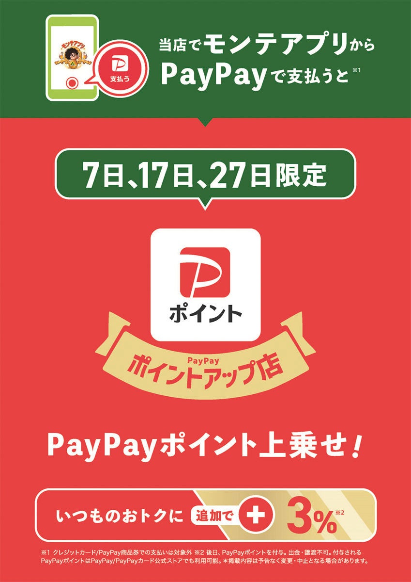 毎月7日、17日、27日の「7のつく日」に対象店舗にご来店のうえ、当社公式アプリ”モンテアプリ(※3)“から「PayPay」で飲食代金をお支払いされたお客様を対象に、「PayPayポイント」を3%追加付与いたします。