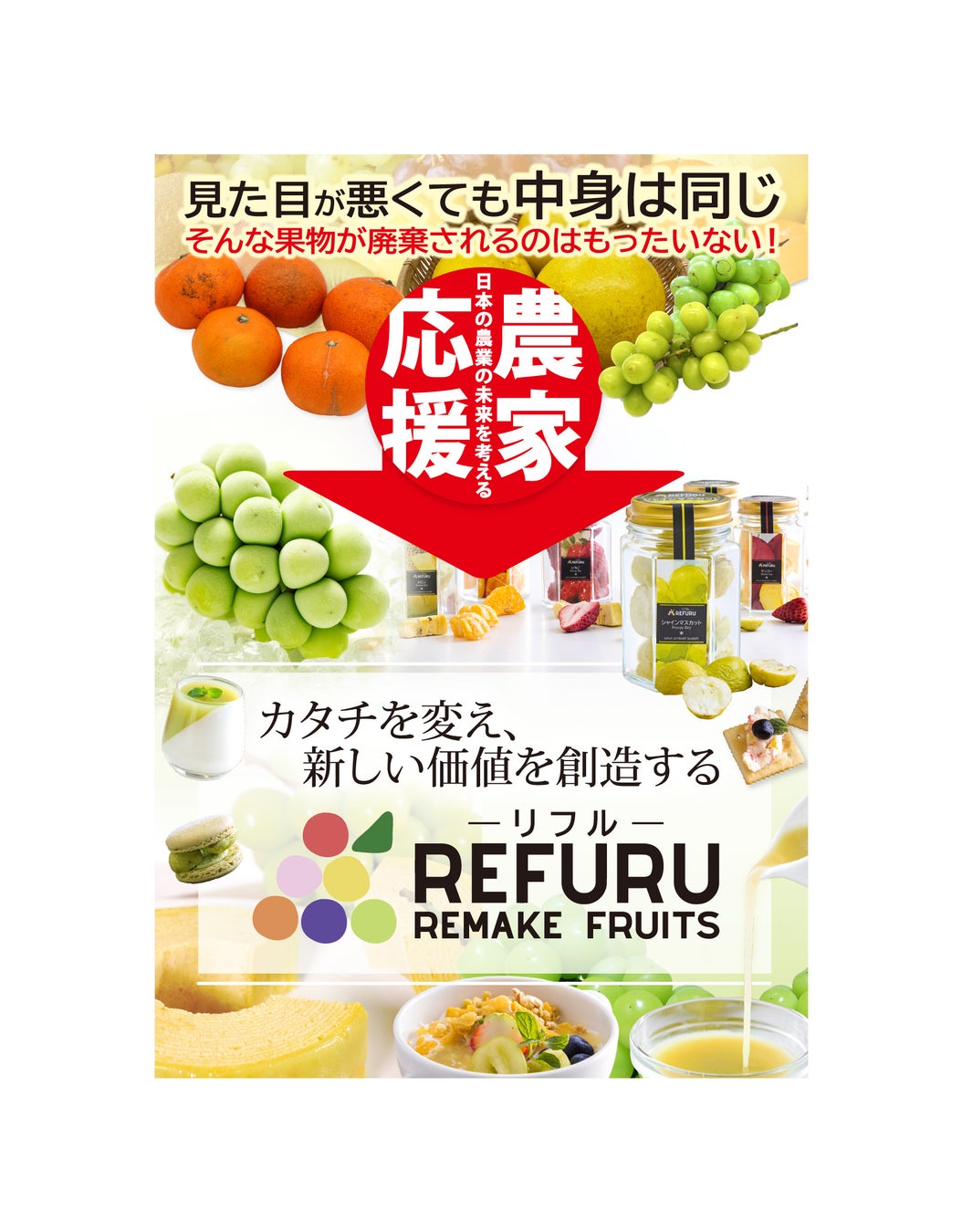 日本グルメ市場では、気候変動等により規格通りの収穫がますます困難になる昨今、農家の収入アップとフードロス削減を同時に実現するべく、改めて果物の見た目を気にする必要のない加工品開発事業に力を入れてまいります。日本の果物の可能性を更に高めるべく、フルーツ加工品ブランドREFURU(リフル)ブランドを立ち上げ、富裕層やギフト需要を狙って商品開発、販売を進める予定です。