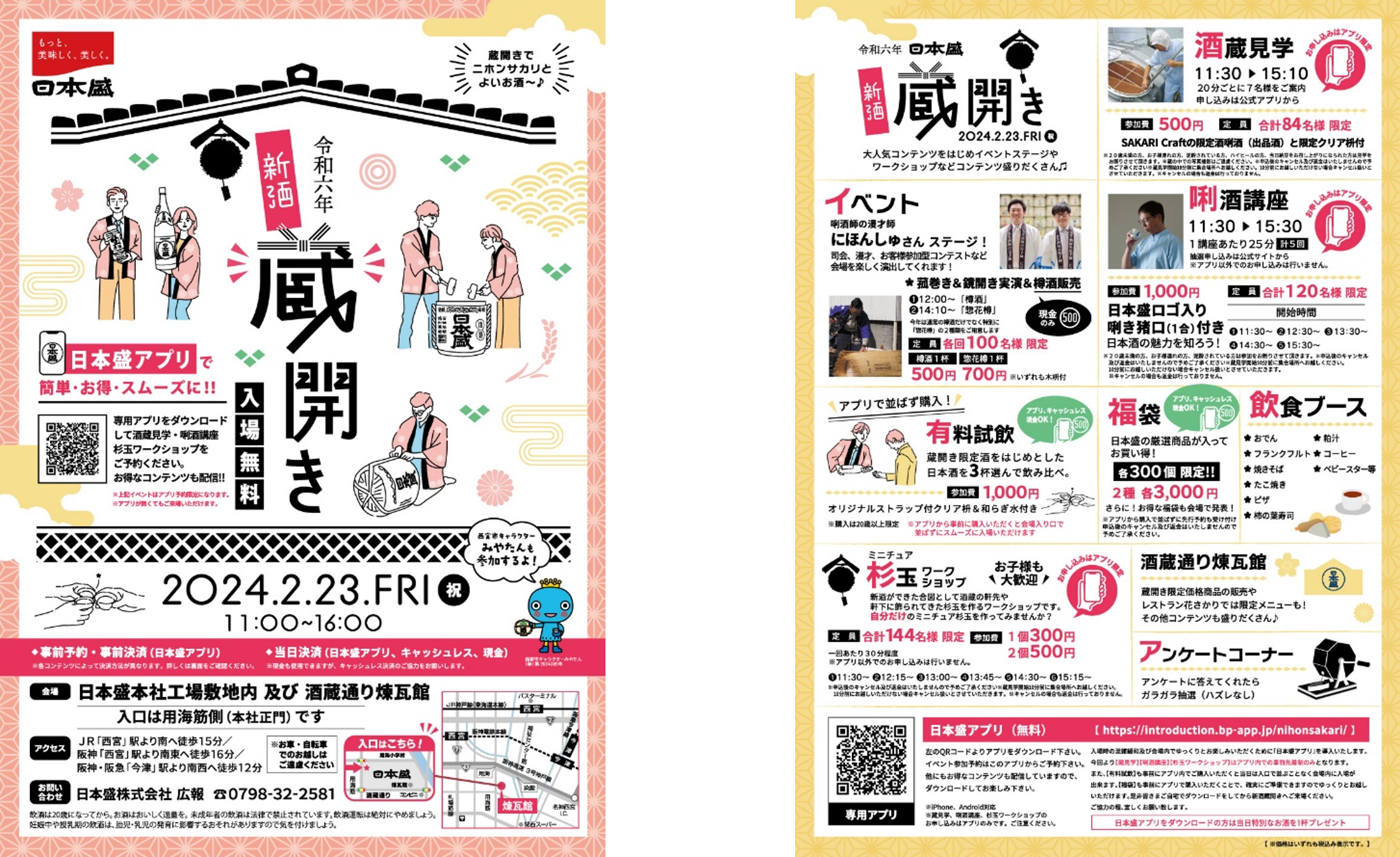 また、今回西宮蔵開きでは初となる、当イベントを簡単・お得・スムーズに楽しんでいただける“日本盛アプリ”を導入いたします。本アプリでは蔵見学、唎酒講座、ミニチュア杉玉づくりへの事前申込や有料試飲、福袋などの事前決済、会場マップの確認、スタンプラリーへの参加などが可能です。さらにアプリをダウンロードいただいた方には、蔵開き会場でお得な特典もご用意しています。