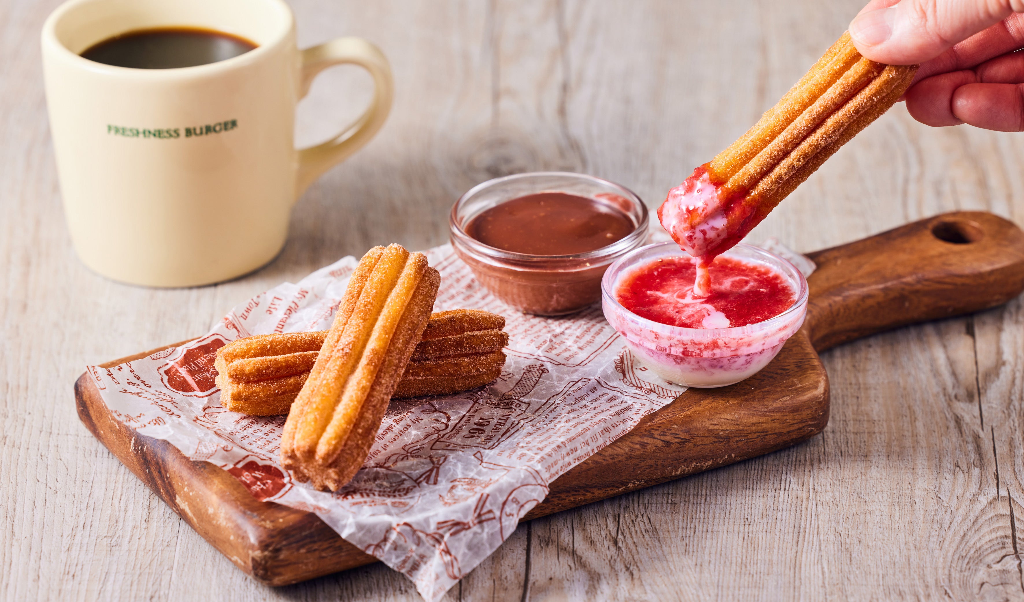 「大人がくつろげるバーガーカフェ」をコンセプトとするフレッシュネスでは、カフェタイムにドリンクと一緒に楽しんでいただけるスイーツ「チュロス」を2023年5月より販売。