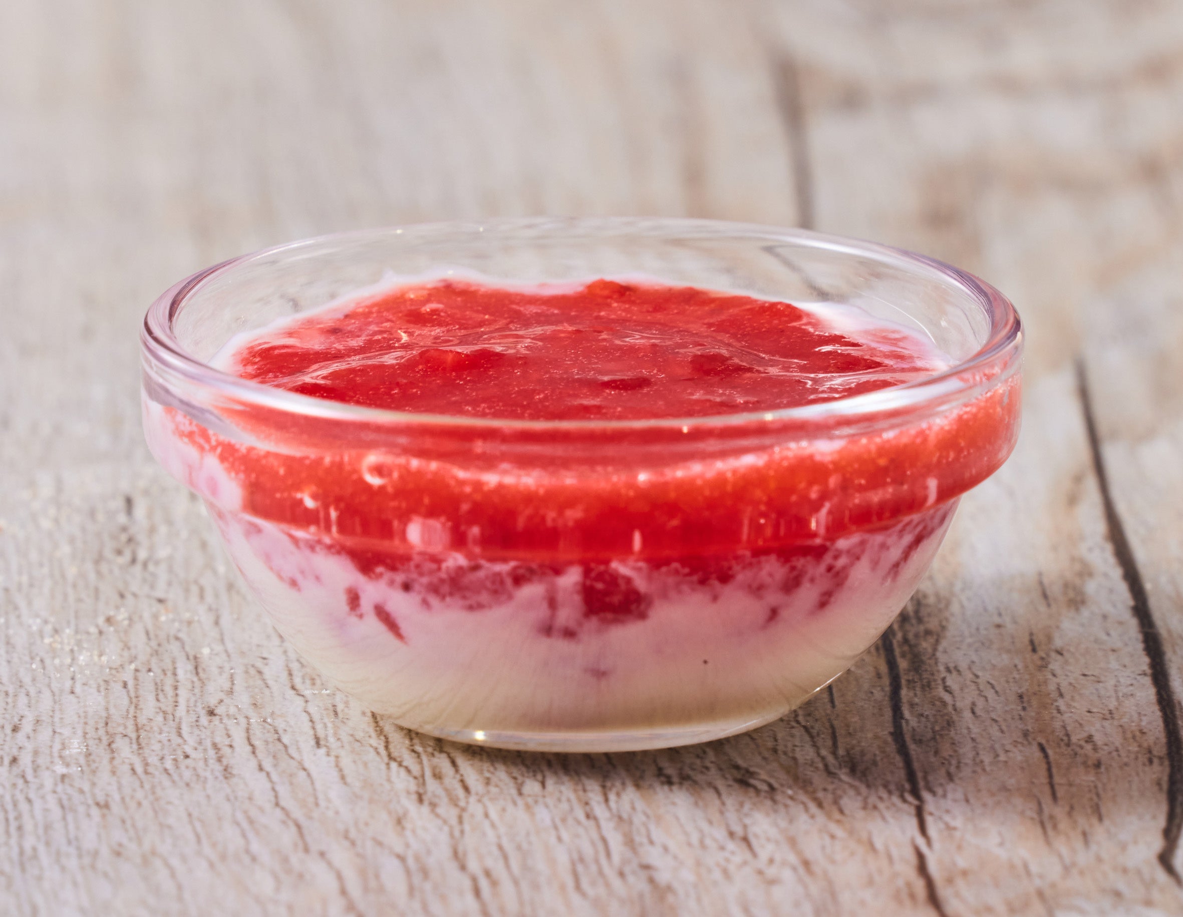 練乳の上に、甘酸っぱいいちごソースをのせ、程よい甘さの中にフルーティーな