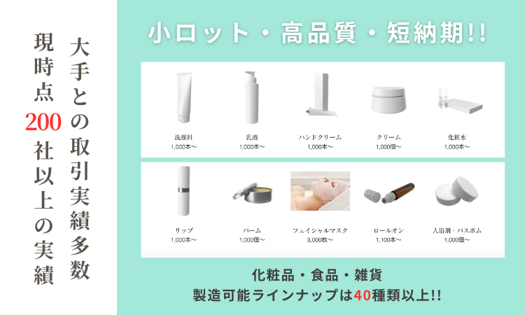 小ロット製品(100〜)も多数取り揃えておりますので、まずはお気軽にお声がけくださいませ。