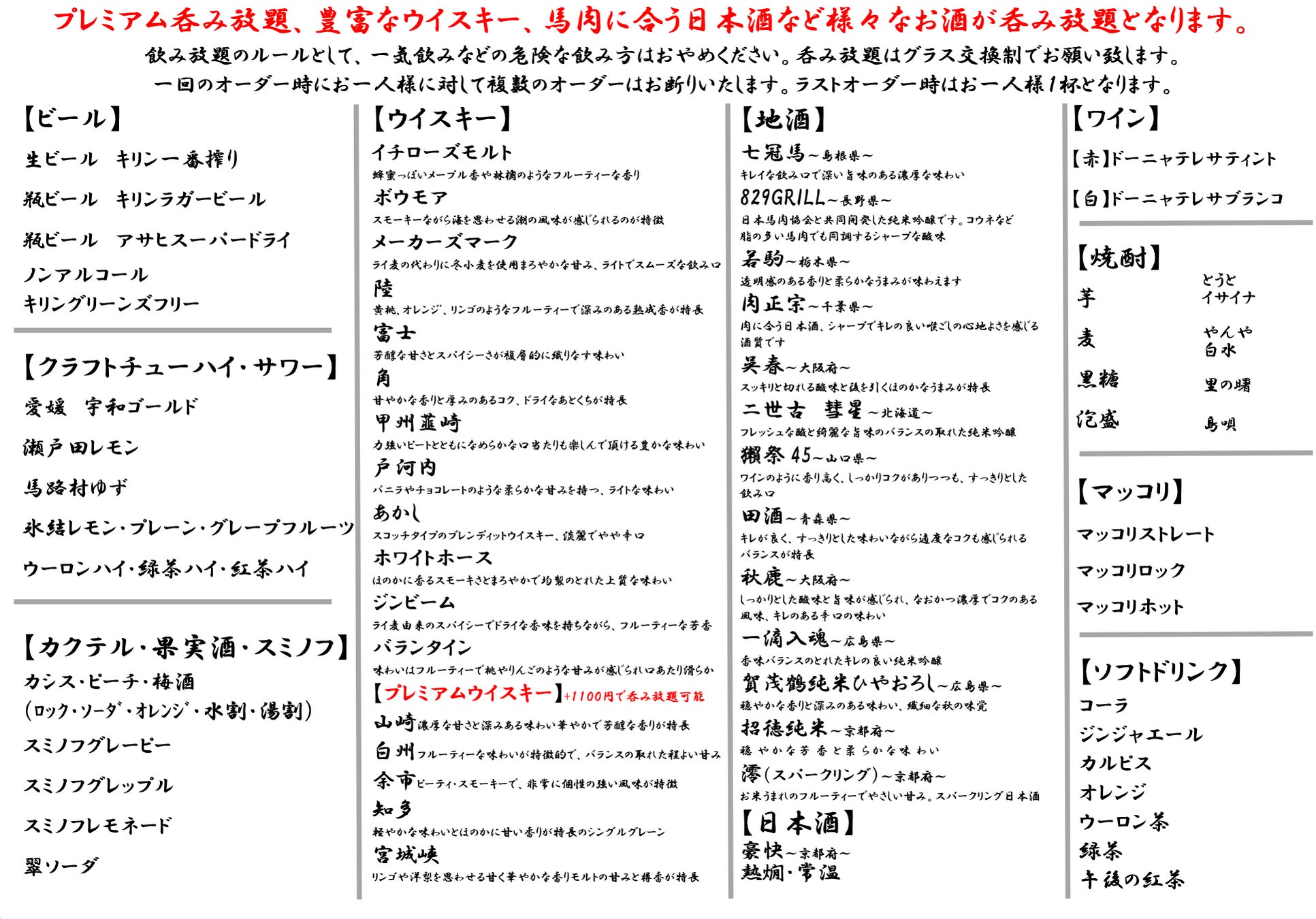 今回スタートするプレミアム飲み放題は、「馬肉食べ放題コース」ご利用の方限定のプランとなっております。