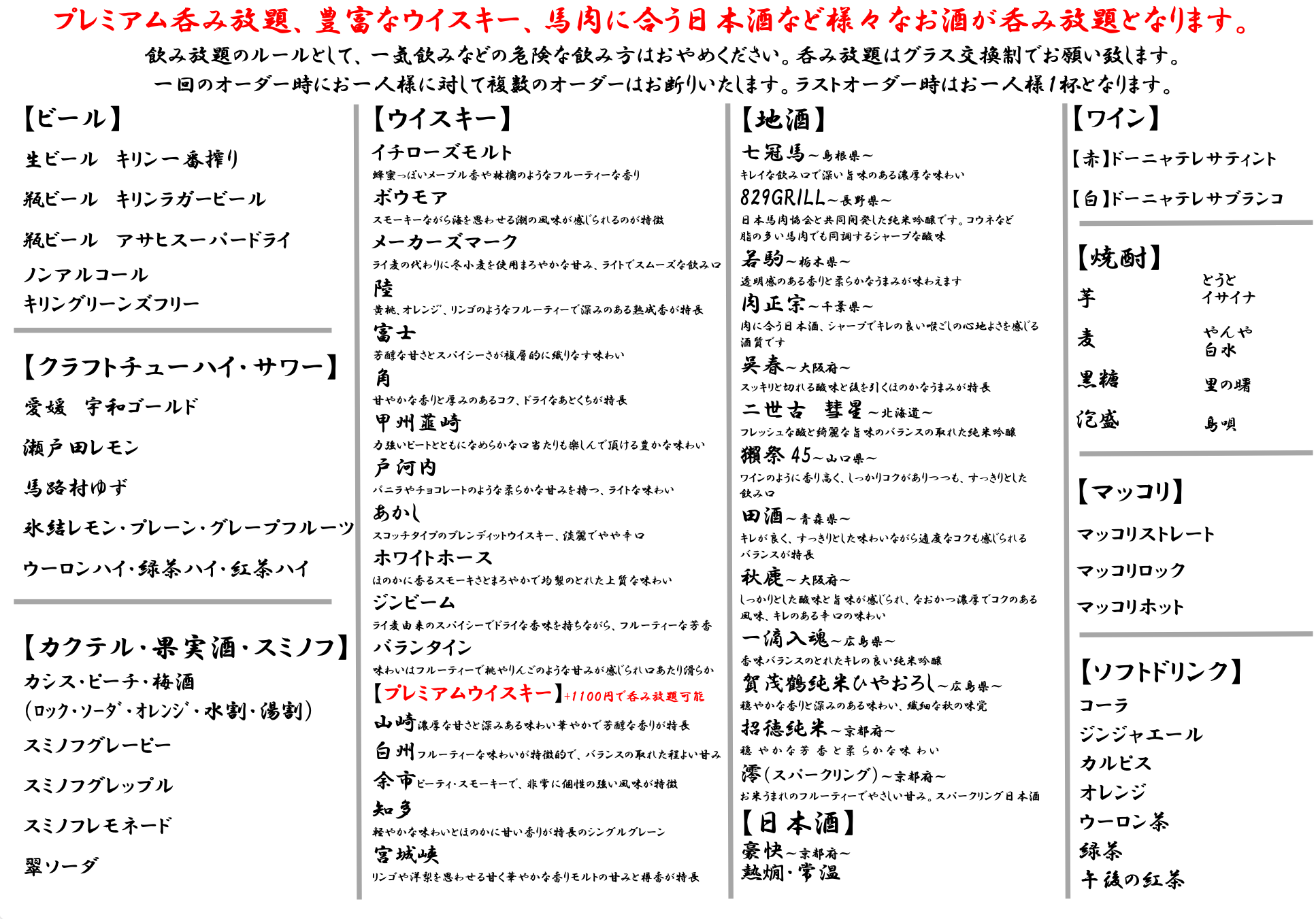 今回スタートするプレミアム飲み放題は、「馬肉食べ放題コース」ご利用の方限定のプランとなっております。