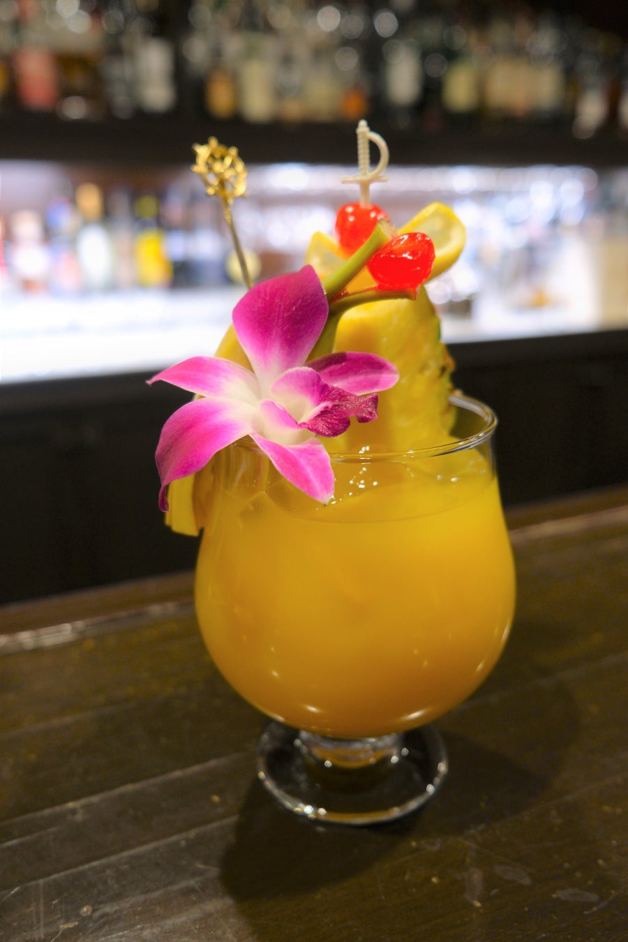 バナナ、マンゴージュース、ココナッツジュース、パインジュース、オレンジュース、白桃、モナンブルーシロップ、バニラアイス、パイナップル、クラッシュアイス、食用花