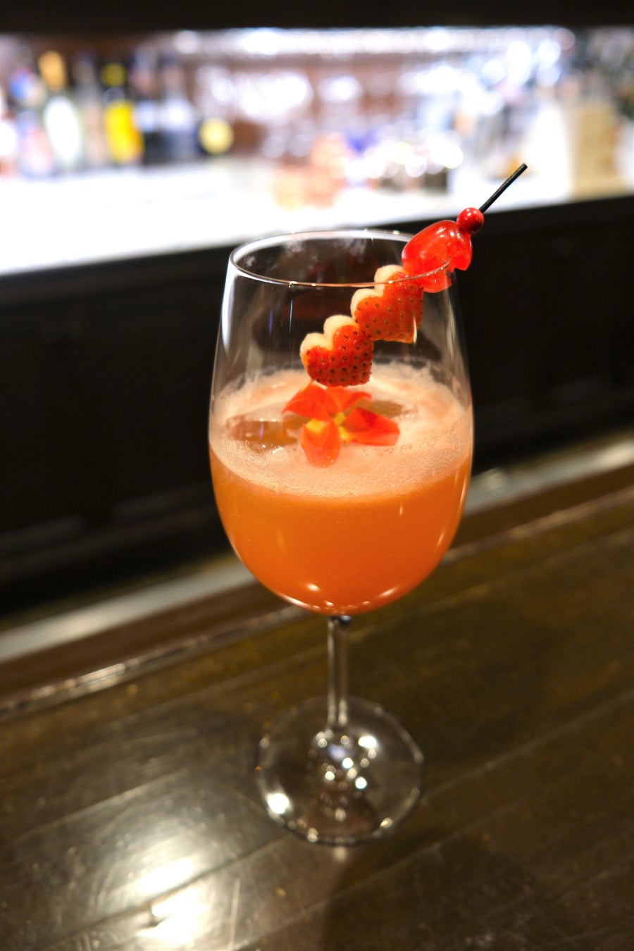 いちごに自家製の桃ジュースを合わせた上品な甘さが特徴のモクテル。赤い色が2人の永遠の愛を連想させます。