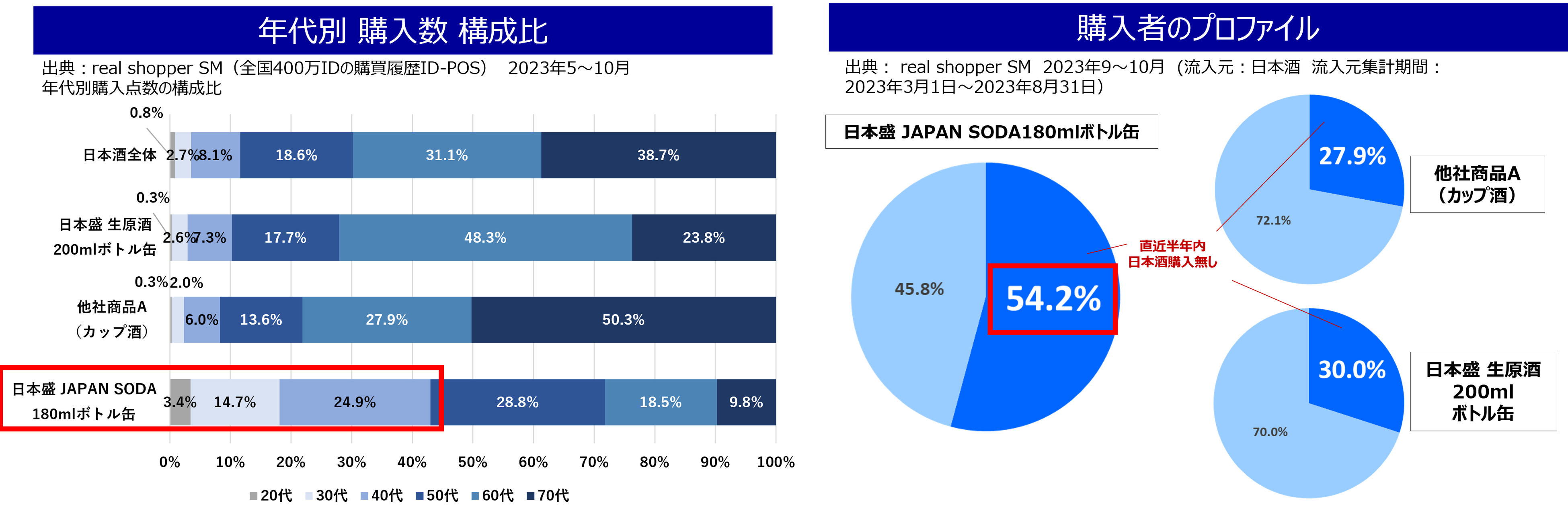日本酒市場は昭和48年度をピークに規模縮小の一途をたどっています※1。特に40代以下のシェアが低く、若年層の獲得が課題となっている中、日本酒の新定番として2023年3月に「日本盛 JAPAN SODA 180mlボトル缶」を発売いたしました。発売以来大変ご好評頂いており、同容量の他社商品A(カップ酒)や弊社の日本酒カテゴリーの中でも若年層に人気のある「日本盛 生原酒200mlボトル缶」と比べ、より若年層の購入率が高く、直近半年で日本酒を購入していない層に購入いただいている商品です。(下記グラフ参照)