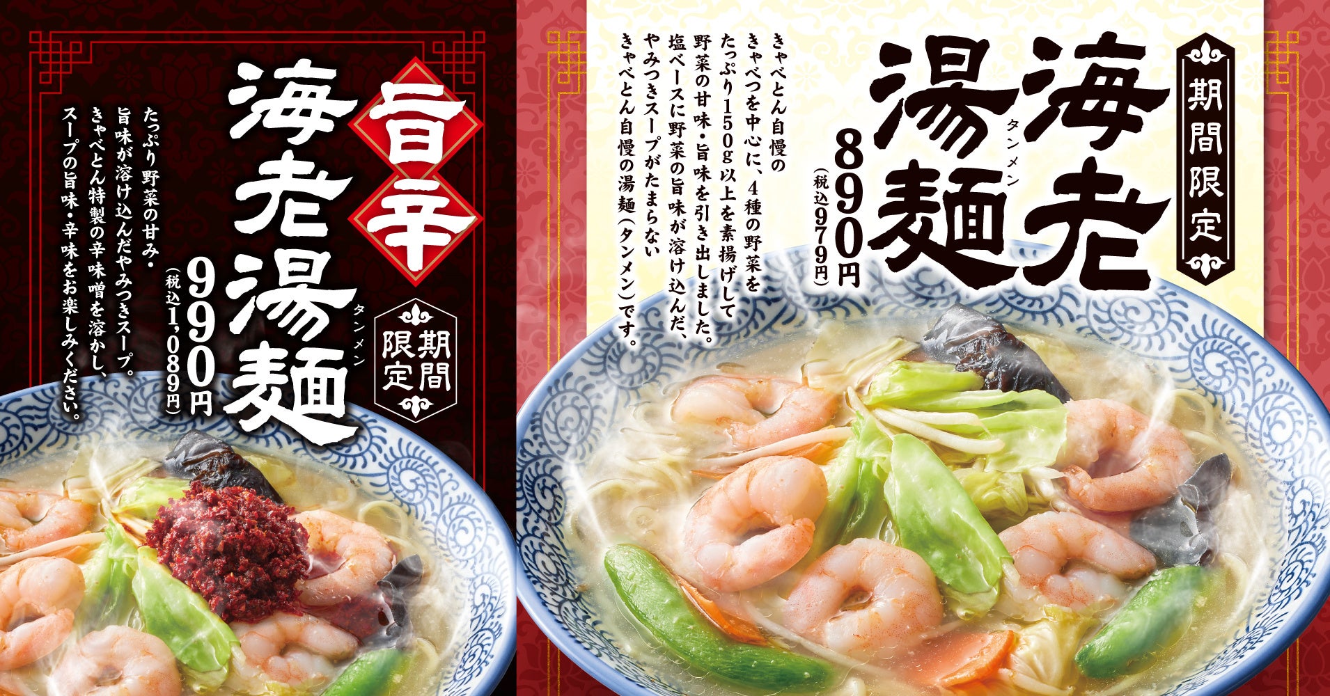 株式会社物語コーポレーション(本社:愛知県豊橋市/代表取締役社長:加藤 央之)が運営する『熟成醤油ラーメン きゃべとん』(以下、きゃべとん)は、2024年2月6日(火)から、期間限定メニュー「海老湯麺」と「旨辛海老湯麺」を販売中です。