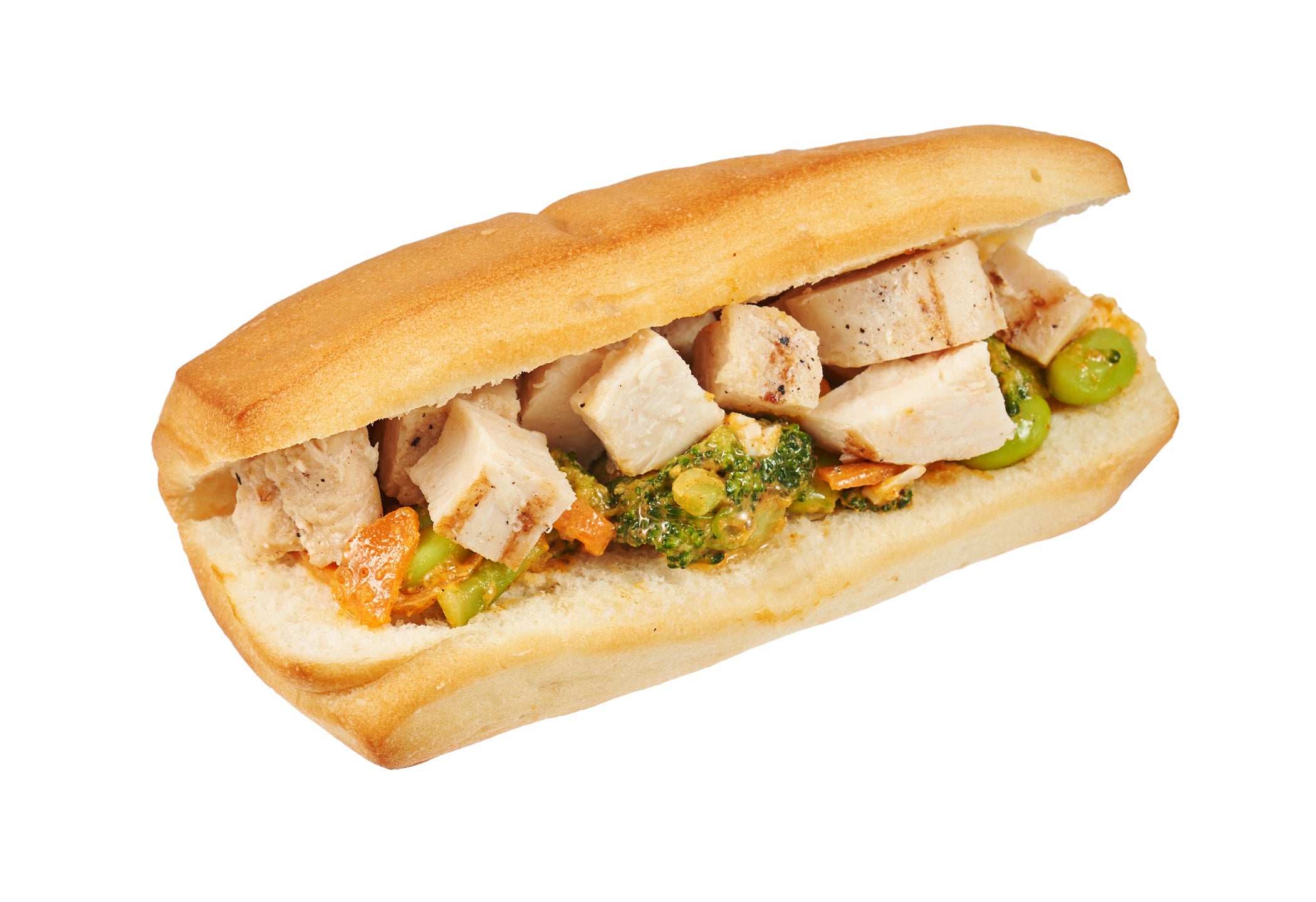 新潟県産米粉入りパンに低温調理でしっとり食感に仕上げた国産チキンとゴロゴロ食感のコブサラダを合わせたサンドです。