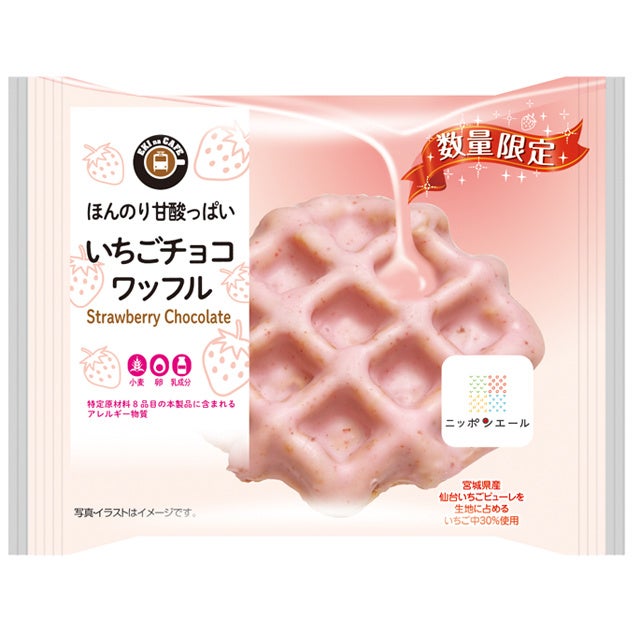 宮城の風土にあった品種を選定して、大切に育てられた、大粒で糖度と酸味のバランスが良いすっきりとした甘さが特徴の「仙台いちご」を使用した「宮城県産仙台いちごピューレ」を生地に練り込み、ふんわり焼き上げたワッフルに、いちごチョコレートをコーティングしました。