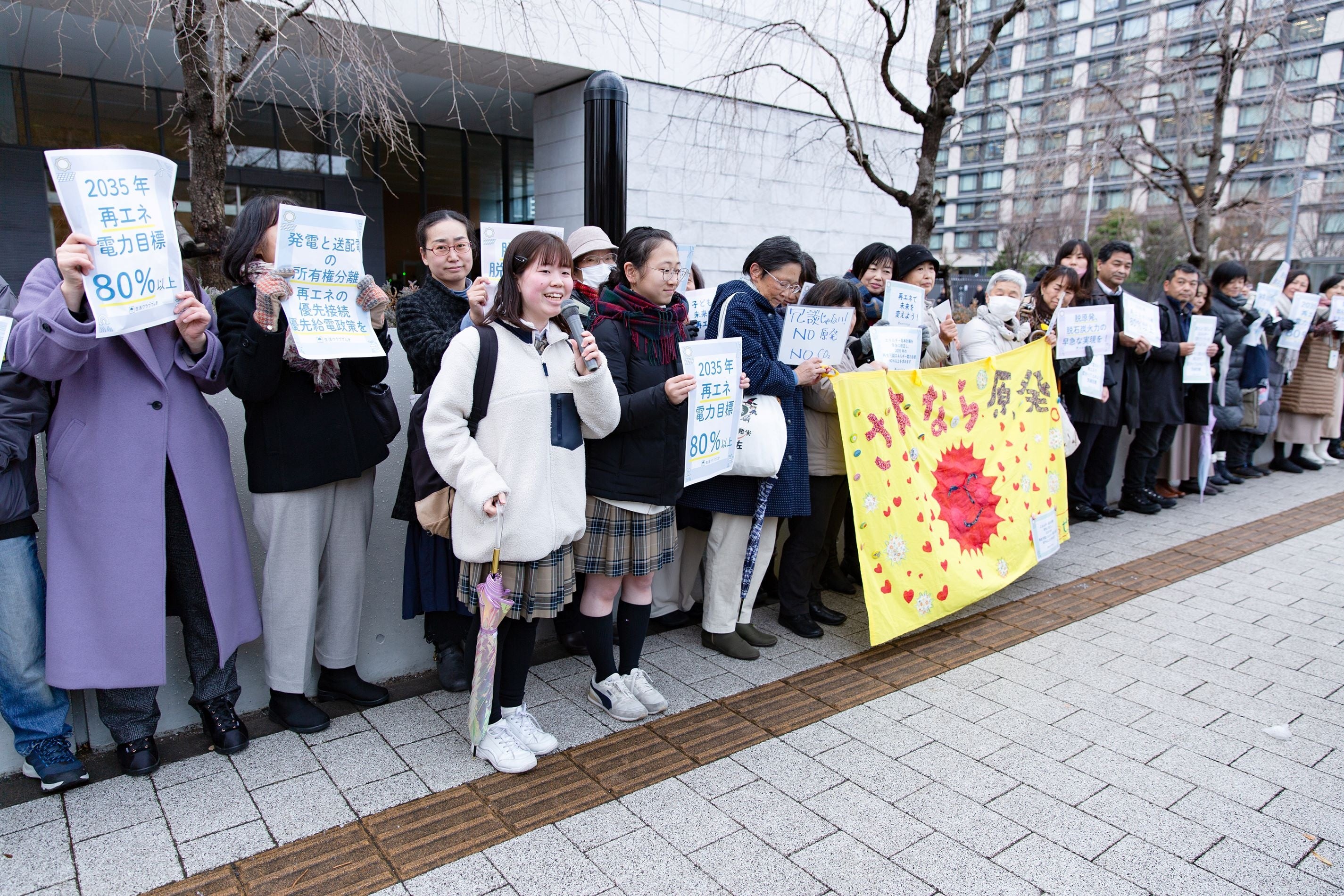 実行委員会で考えたオリジナルコール「変えよう変えようエネルギー 電気でミライを変えようよ 変わろう変わろう再エネで 変わって止めよう気候危機」を唱和し、それぞれの想いを述べました。