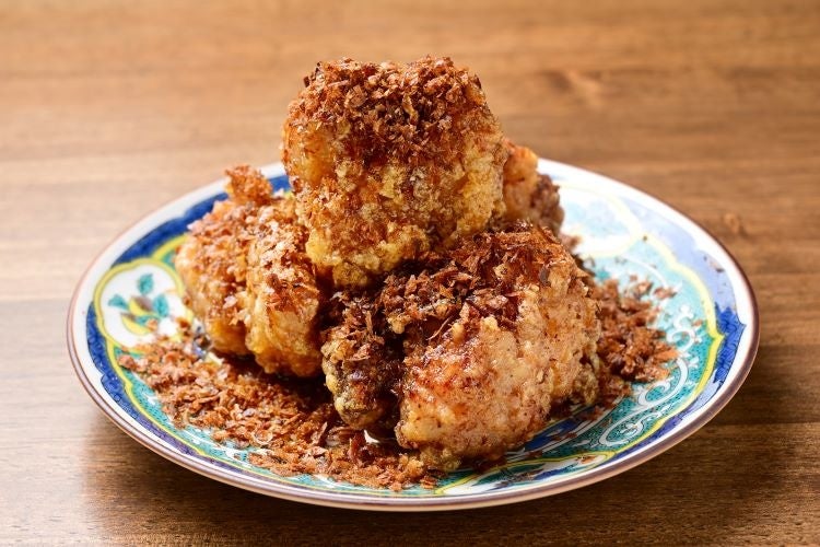 衣にまとうパリッと食感のかつおふりかけと甘辛い手羽先風のタレが相性抜群の逸品です。