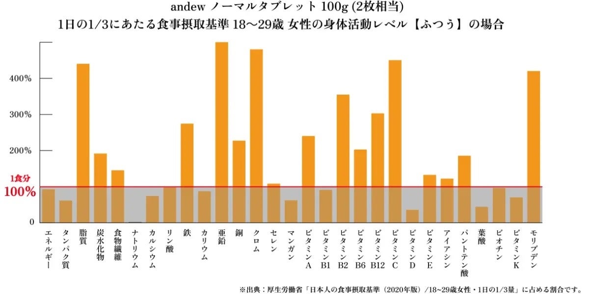 下表は、andew ( 1枚50g )2枚に含有している各栄養素の成人男性の1日の基準量に対する割合を示したものです。