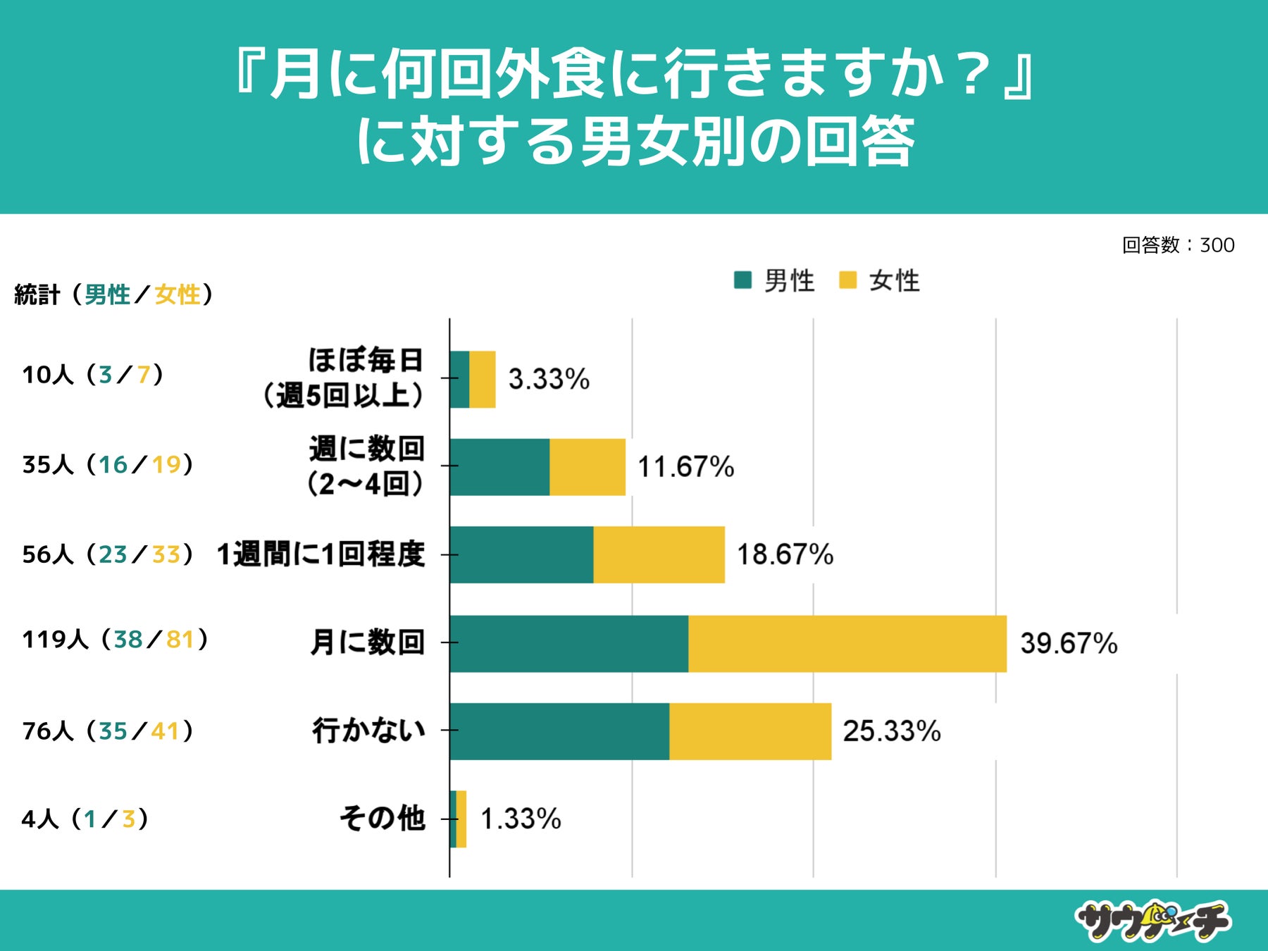 10〜30代男女を対象とした『月に何回外食に行きますか?』というアンケートで、最も多かった回答は「月に数回」で約40%でした。