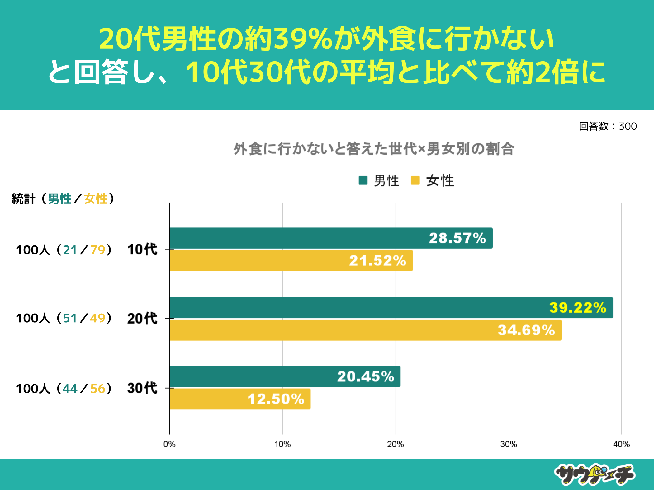 【20代男性の約39%が外食に行かないと回答し、10代30代の平均と比べて約2倍に】
