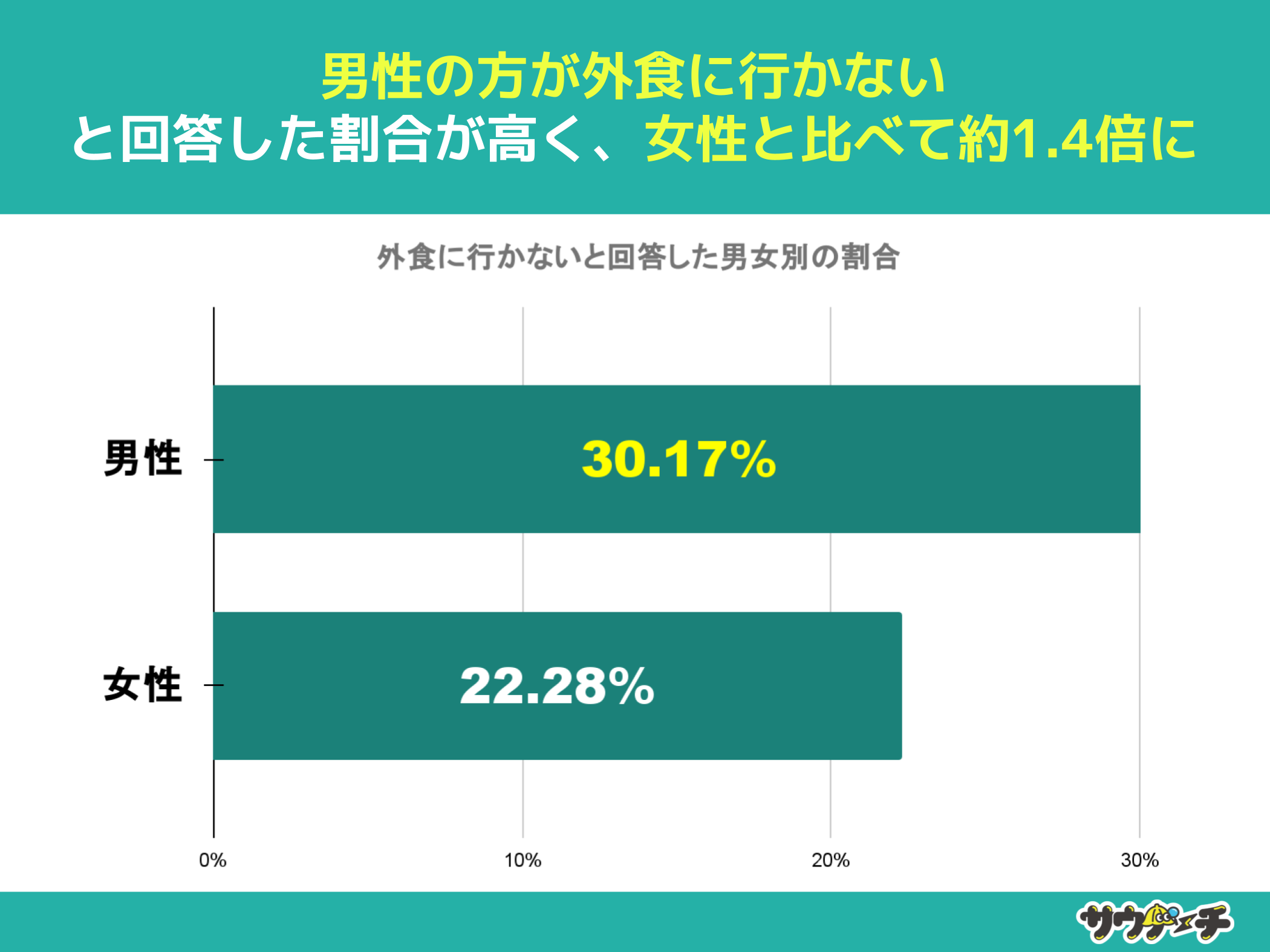 外食に行かないと回答した割合を男女別でみてみますと、男性が約30%、女性が約22%で、女性と比べて男性は約1.4倍高い結果となりました。