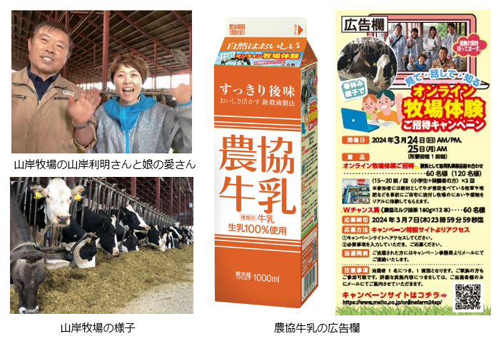 第6弾となる「春休み、親子で!オンライン牧場体験ご招待キャンペーン」では、農協牛乳の側面広告や協同乳業(株)公式Xを通じて特設キャンペーンサイトより募集します。募集期間は、2月10日(土)~3月7日(木)の約1か月間です。抽選で60組の方を、3月24日(日)、25日(月)に開催する「オンライン牧場体験」にご招待。体験では酪農家の仕事や乳牛について、リアルタイムで繋がりながら、「見て、話して、知る」ことができるよう、牧場を紹介していきます。