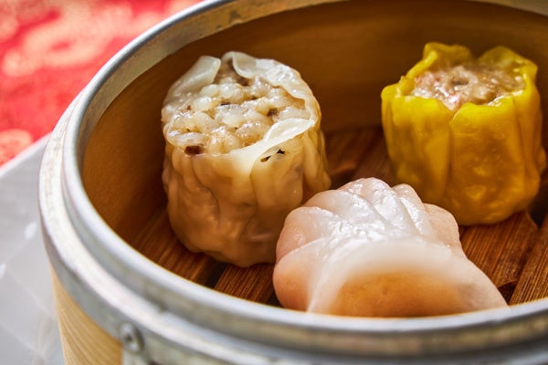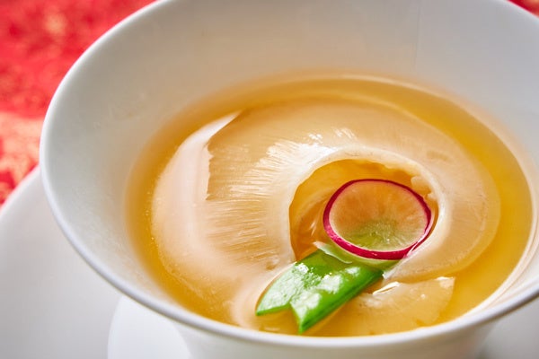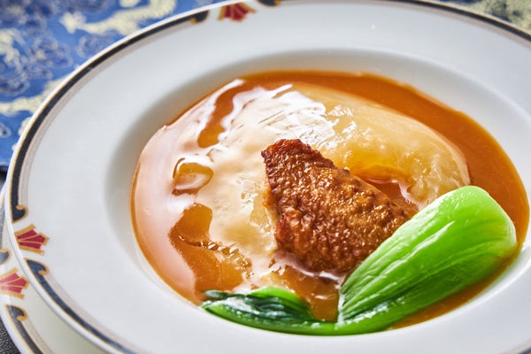ランチコースで好評いただいている “ふかひれ姿煮入りスープ”は、茶碗蒸しにふかひれ姿煮をのせ、じっくり丁寧に仕上げた清湯スープを注いだ逸品をご用意いたします。広東でも代表的な点心は、こだわりの広東焼売を含めた3点をお楽しみください。四川省で採れる太くて丸い形が特徴の朝天唐辛子を使った“国産牛とカシューナッツ 四川唐辛子炒め”は、ピリリと辛く香り高い一品に仕上げました。4種類の豆板醤をブレンドした“麻婆豆腐ご飯”など、食事は3種類からお選びいただけます。中国を旅した気分でご賞味ください。