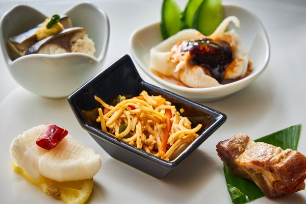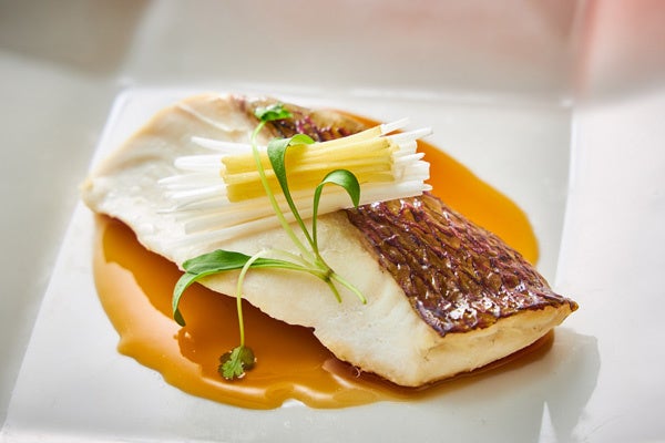 “四川と広東の前菜五種盛り合わせ”では、塩漬けした豚肩ロース肉をタレに漬け込み、食欲のそそるカレー風味に焼き上げた焼き叉焼などをお召し上がりください。 “真鯛蒸し 広東醤油かけ”は、ふっくらと蒸した真鯛と、滑らかなとろみとまろやかな甘みが特徴の広東醤油がベストマッチな逸品。“海老と季節野菜入りXO醤炒め”は、素材の味と芳醇な旨味をお楽しみいただけます。そのほか、ふかひれ姿煮や四川ダックなど、高級食材も登場します。食後はマンゴーソースと相性抜群のココナッツプリン・ふんわり食感の中華風カステラの2種をご用意いたしますので、締めくくりのデザートまでご堪能ください。