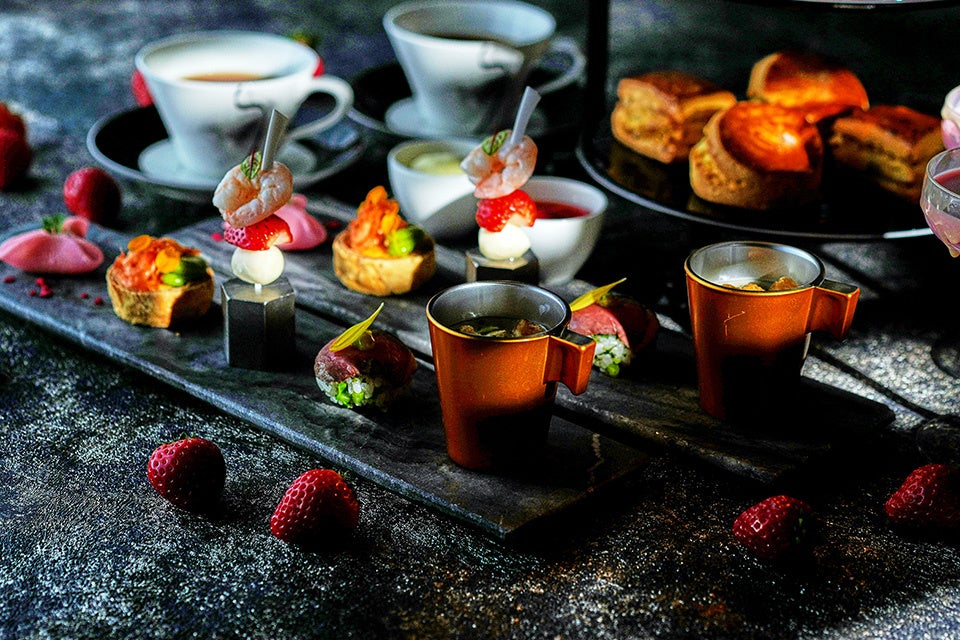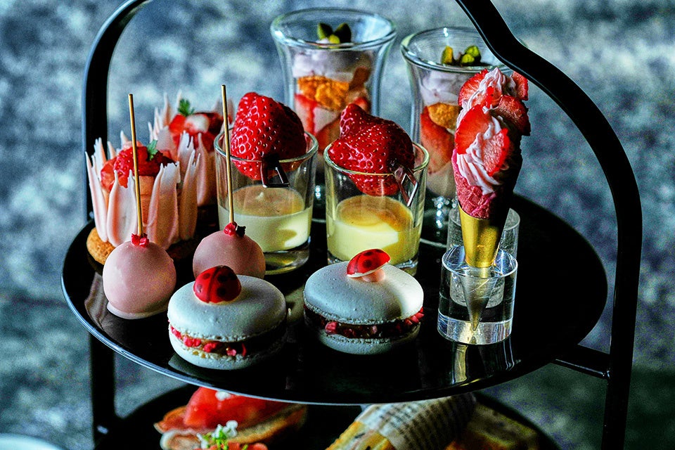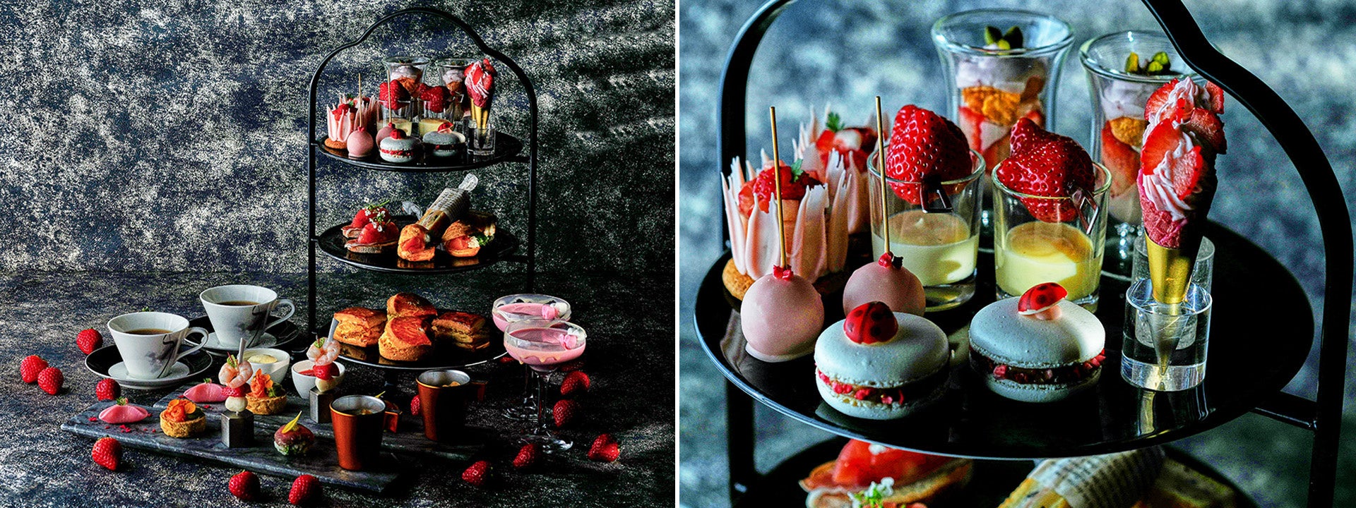 SHIBUYA STREAM HOTELとして最初のアフタヌーンティーは、ぽかぽか陽気で気分もファッションも明るくなる「春」をテーマとし、苺をふんだんに使ったメニューのラインナップでお届けします。柑橘の爽やかな風味が広がるオレンジクリームに苺チョコレートを纏わせたロリポップは、カジュアルに渋谷の街を歩くイメージで食べて欲しい一品に。滑らかな苺プリンやフレッシュな苺、クリームなどを層にした小さなパフェは、おしゃれな洋服を選ぶワクワク気分で。人気のスコーンには、シーズンフレーバーとして、レモンスコーンが登場。レモンコンフィチュールを練り込んでおり、ほどよい酸味と甘さが、春の訪れを感じさせます。セイボリーは、桜エビと色鮮やかなそら豆のキッシュや、大根をビーツで色付けし、まるで桜の花びらのような紅ズワイガニのサラダなど、お花見をしているような気分になる見た目も楽しめる品々をご用意しました。ウェルカムドリンクでは、苺の甘さの中にもあっさりとした味わいのピンクカラーが際立つノンアルコールカクテル「なでしこ」でお客さまをお迎えします。まるで、ファッショナブルで洗練されたジュエリーや洋服のようなスイーツを、春色のおしゃれを楽しむ気分でお召し上がりください。