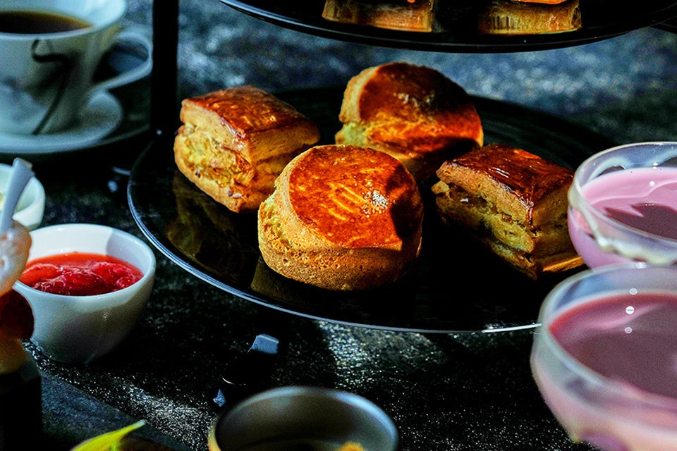 小麦の香りが広がり、中はしっとりするよう焼き上げたスコーンのシーズンフレーバーは、レモン。レモンコンフィチュールを練り込んでおり、鼻に抜ける爽やかな香りと甘酸っぱさが楽しめます。更にフルーティーさを増したい方は、オレンジをアクセントとした自家製苺ジャムで追いフレーバーがおすすめです。
