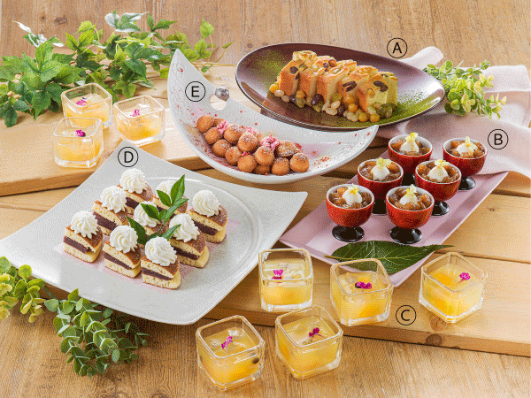 焼きフルーツと季節のジュレのグラスデザート / 最中をのせたレアチーズケーキ / 抹茶のガトー ミルクチョコレートを添えて / 抹茶のクッキー レモンのアクセント / ホテル特製 季節のショートケーキ / なめらかプリン など