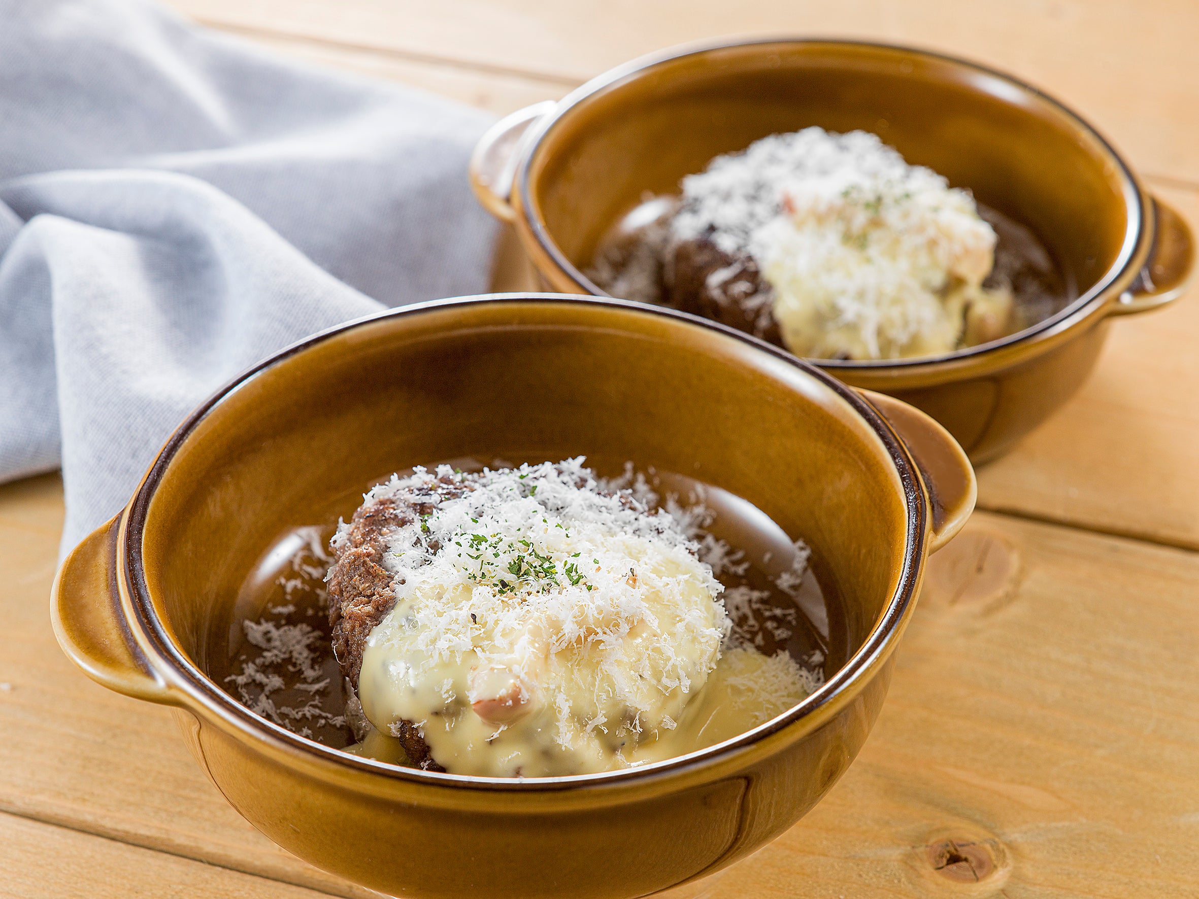 厳選国産牛のみを使用した味に深みがある贅沢なハンバーグ。