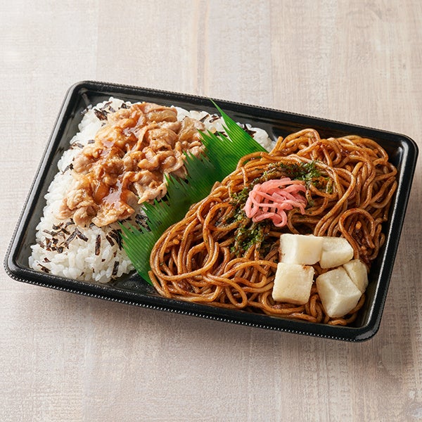 【内容】栃木県産ハーブ豚を使用した濃いめの味付けをした豚生姜焼きをごはんの上にのせ、じゃがいも入りの焼きそばと合わせたボリュームあるお弁当です。
