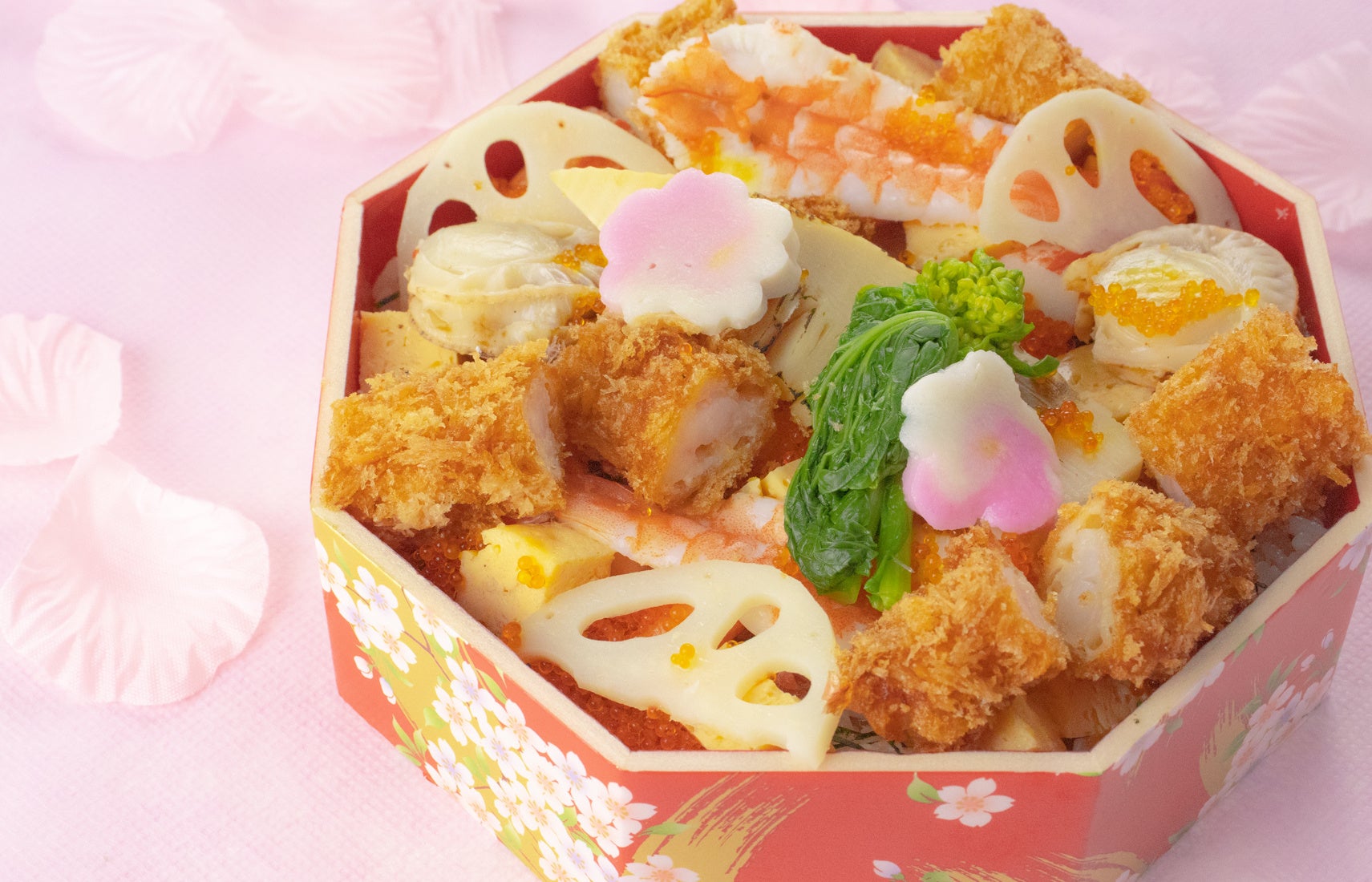 上いくら・煮貝・サーモンユッケ・〆サバ・ボイルエビ・ボイルホタテ・エビフライ・ウィンナー・とびっこ・レンコン・玉子焼き・タケノコ・菜の花・おぼろ・桜麩・刻みのり